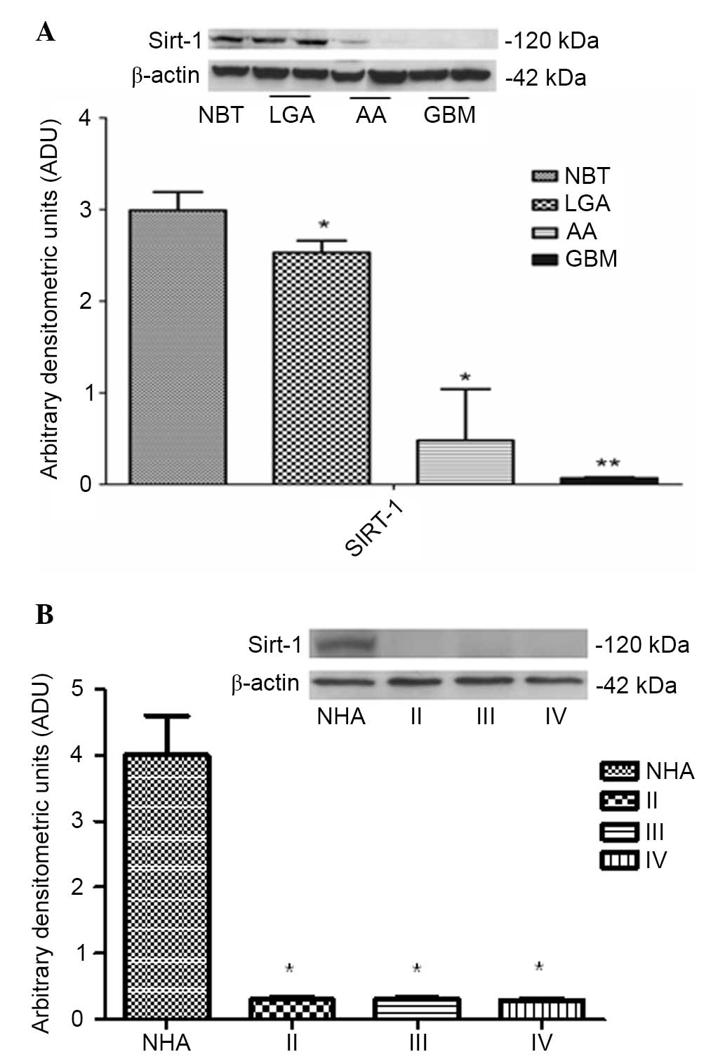 Sirt-1 protein expression was downregulated in high-grade tumors (AAs and GBMs) compared to LGAs and controls (NBTs), as shown in Fig. 1 (LGA and AA vs. NBT, P<0.01; GBM vs. NBT, P<0.001). In addition, a similar pattern of Sirt-1 expression was observed in glioma cell lines compared to NHAs (P<0.0001; Fig. 1B).