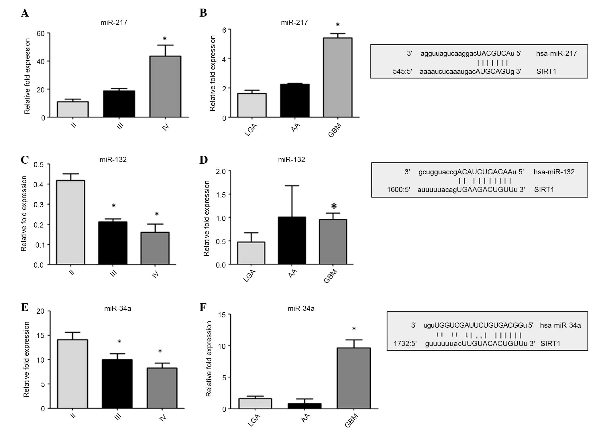 Furthermore, the level of expression of miR-132, miR-34a and miR-217 was quantified, which were chosen by analyzing the alignment details of the 3′-UTR region of Sirt-1 with a computational miRNA target prediction tool (www.microRNA.org/) and comparing the results with validated pathways (Fig. 3). miR-217 (P<0.001 vs. LGA and II primary cells; Fig. 3A and B) and miR-34a (P<0.001 vs. LGA and PGLAC (grade II) cells; Fig. 3E and F) were consistently upregulated in high-grade glioma and tumorous cell lines, while a downregulation of miR-132 (P<0.001 vs. LGA and PGLAC (grade II) cells; Fig. 3C and D) was observed in high-grade glioma cell lines. These data suggest that the assessed miRNAs inversely modulate Sirt-1 expression, depending on the glioma grade. Analysis of Sirt-1 and miRNA expression may be a valuable marker of glioma progression.