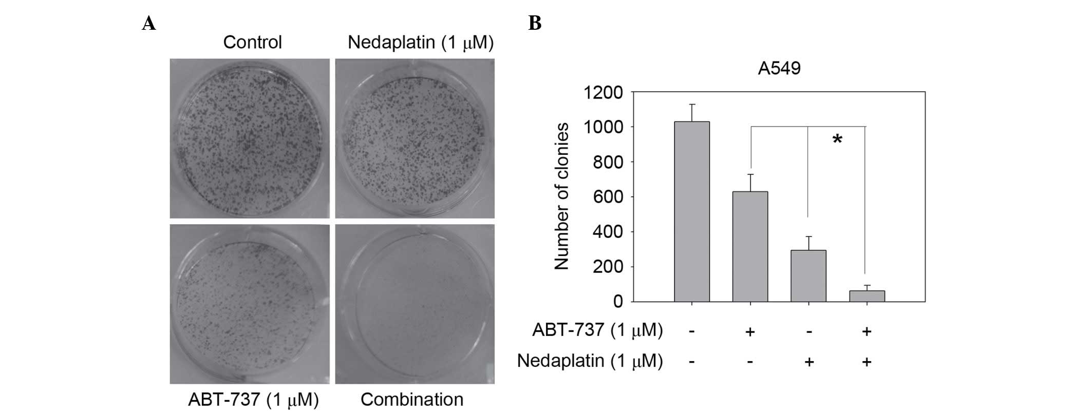 Cancer cells were plated at 500–1,000 cells per dish, and then cells were exposed to nedaplatin (1 µM), ABT-737 (1 µM) or a combination of the two. After 14 days, dishes were stained by crystal violet and colony numbers were counted.