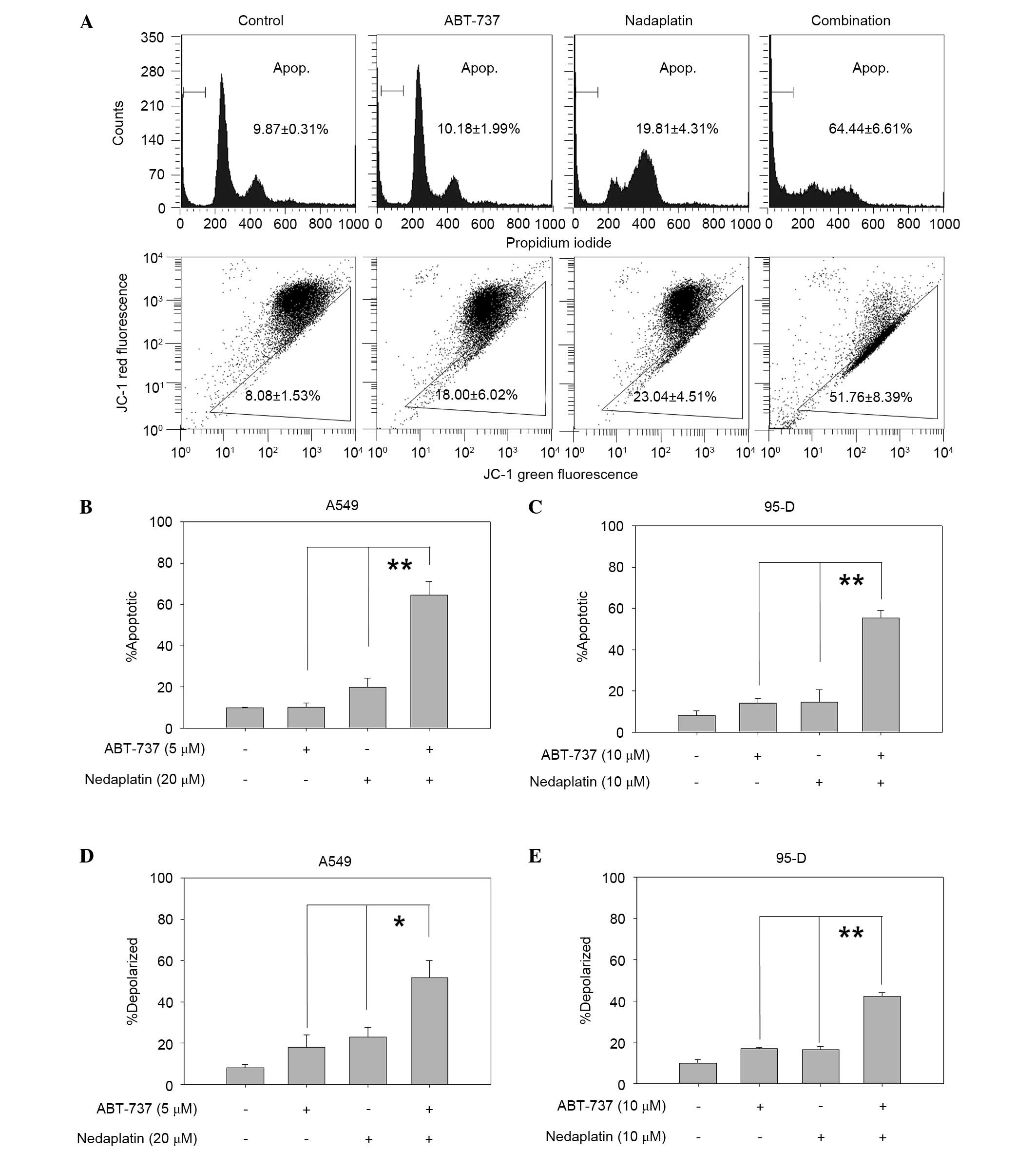 Rapid loss of mitochondrial membrane potential and the release of cytochrome c are considered to be the hallmarks of mitochondrial dysfunction, which can induce the activation of caspases and lead to apoptosis (10). Thus, the present study investigated whether or not apoptosis induced by nedaplatin plus ABT-737 was triggered by mitochondrial dysfunction. As shown in Fig. 3A (bottom panel), nedaplatin plus ABT-737 resulted in an increased percentage of mitochondrial membrane depolarized A549 cells than compared with a single agent used alone (51.76% in combination treated cells, 23.04% in nedaplatin-treated cells, 18.00% in ABT-737-treated cells and 8.08% in control group; ABT-737 vs. combination, P=0.03; nedaplatin vs. combination, P=0.04). Combination treatment with nedaplatin and ABT-737 resulted in increased mitochondrial membrane potential in A549 and 95-D cell lines (Fig. 3D and E).