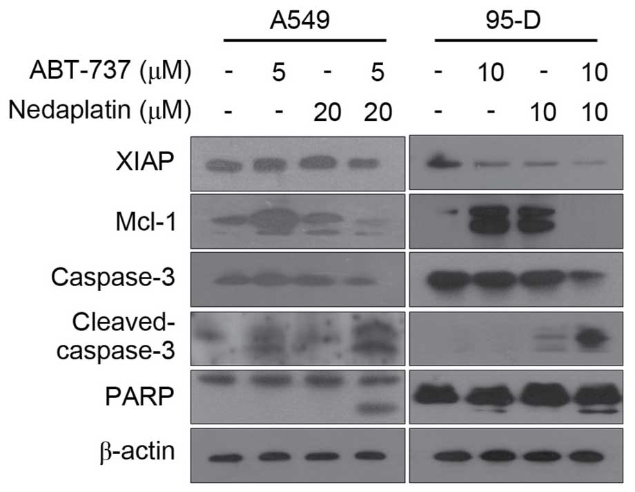 To further assess whether increased ABT-737-mediated apoptosis by nedaplatin-induced caspase activation, immunoblot analysis was performed. As shown in Fig. 4, combined treatment markedly activated caspase-3 and PARP in both A549 and 95-D cells. In addition, combination treatment also resulted in potentiation of XIAP downregulation in A549 and 95-D cells. Overall, nedaplatin and ABT-737 showed a synergistic effect by inducing apoptosis in cancer cells.