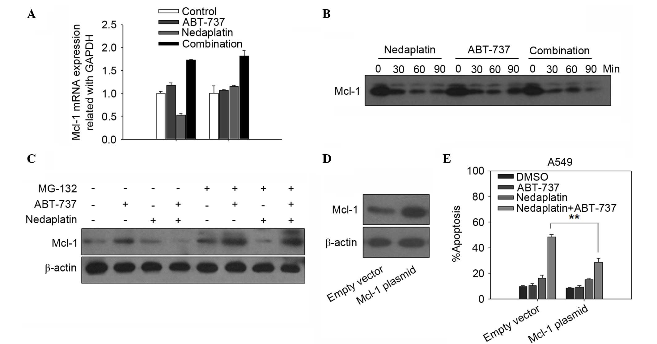 To further evaluate whether the downregulation of Mcl-1 was required for nedaplatin plus ABT-737-induced apoptosis, the expression of Mcl-1 protein was successfully increased via transfecting pTOPO-Mcl-1 plasmid to A549 cells (Fig. 5D). Mcl-1 overexpression significantly decreased apoptosis in A549 cells treated with nedaplatin plus ABT-737 (Fig. 5E). The present results indicated that downregulation of Mcl-1 may contribute to the synergistic killing of cells by the combination of nedaplatin and ABT-737.