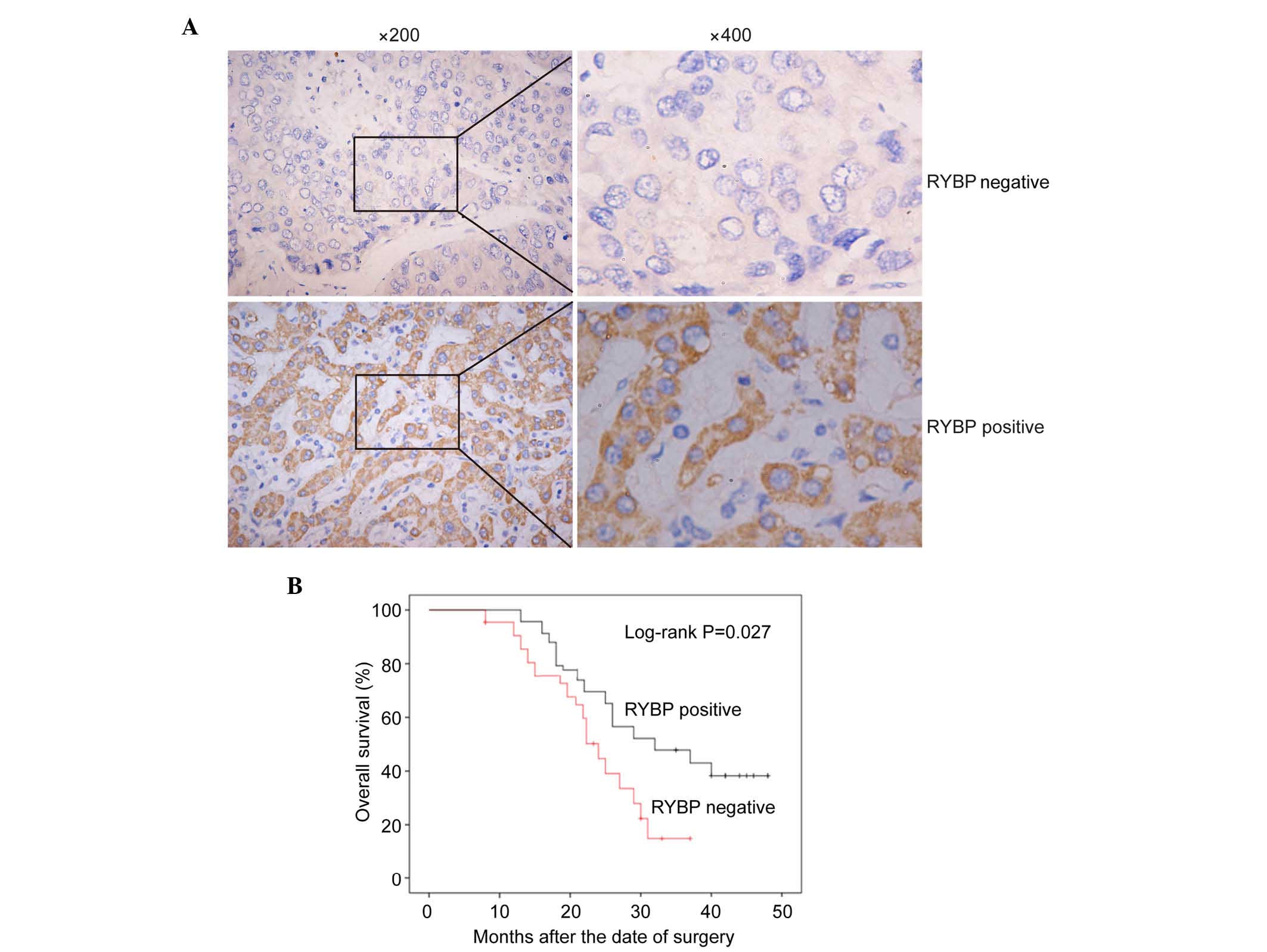 Table I.Association between the expression of RYBP and clinicopathological features of hepatocellular carcinoma. |