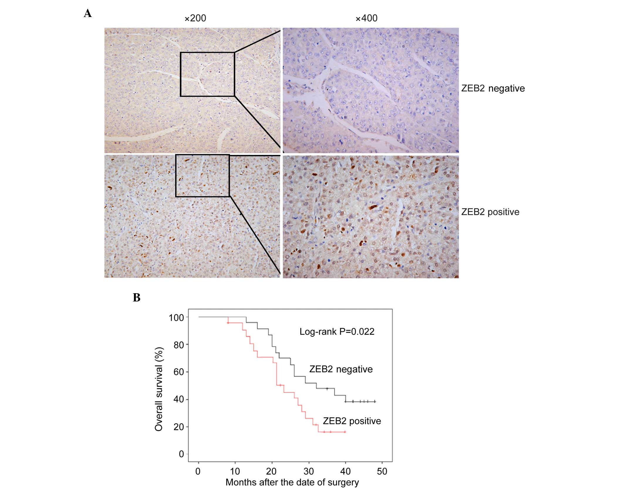 Cai MY, Luo RZ, Chen JW, Pei XQ, Lu JB, Hou JH and Yun JP: Overexpression of ZEB2 in peritumoral liver tissue correlates with favorable survival after curative resection of hepatocellular carcinoma. PLoS One. 7:e328382012. View Article : Google Scholar : PubMed/NCBI | |