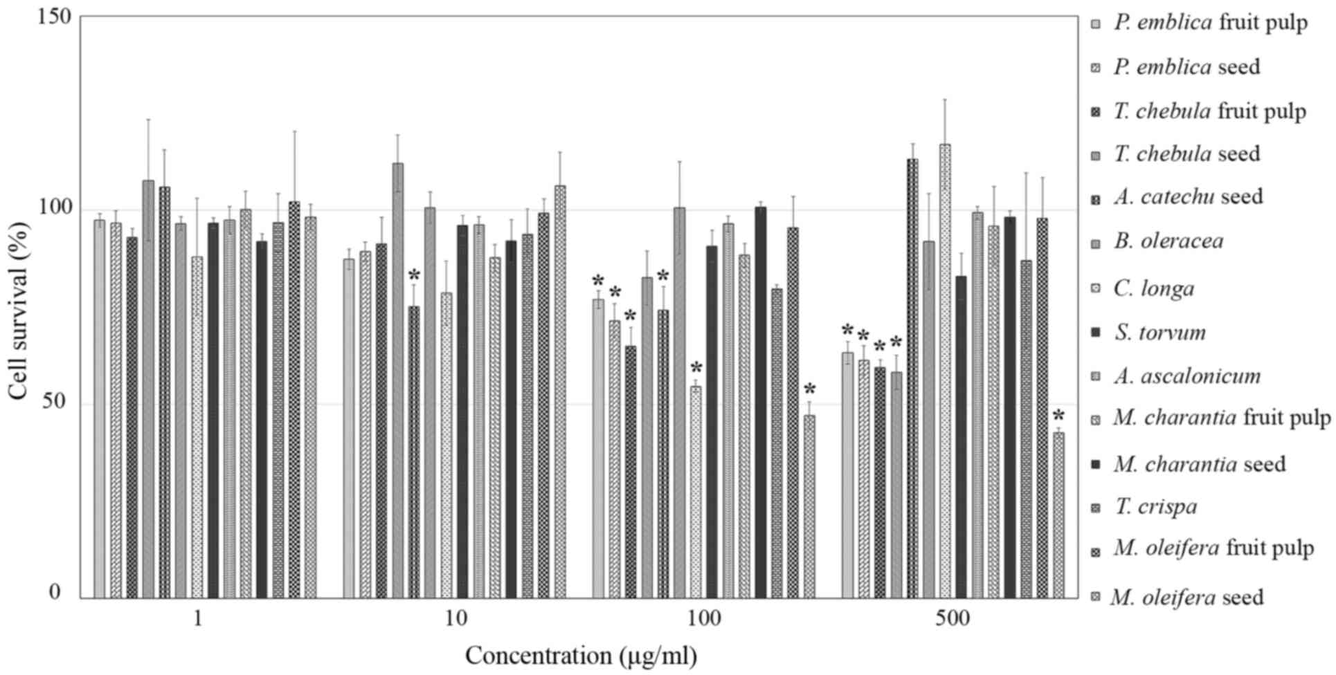 All plant samples including PEf, PEs, TCf, TCs, ACs, BO, CL, ST, AA, MCf pulp, M. charantia seed (MCs), TiC, M. oleifera fruit (MOf) pulp and MOs were purchased from Rangsit market in Amphoe Mueang, Pathum Thani province, Thailand. The fruits were separated into pulp and seed and all of the samples were dried at 55°C and ground into powder. Powder samples (15 g) were macerated with 300 ml 95% ethanol for 24 h. Extract solutions were subsequently dried by rotary evaporation and freeze-drying, and stored at −20°C until required. The sample extracts were freshly prepared in dimethyl sulfoxide (DMSO) to the concentration of 50 mg/ml then diluted with HAM's F12 medium (Gibco; Thermo Fisher Scientific, Inc., Waltham, MA, USA) to the concentration of 1–500 µg/ml.