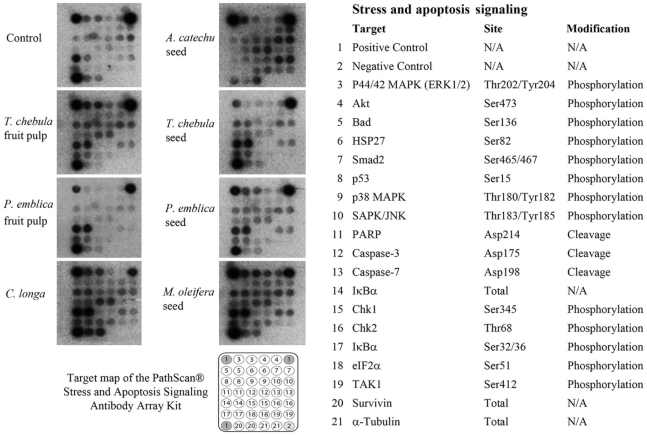 RMCCA1 cells were treated with seven selected extracts (PEf, PEs, TCf, TCs, ACs, CL and MOs) prior to using the PathScan® Stress and Apoptosis Signaling Antibody Array kit with a chemiluminescent readout (cat. 12856; Cell Signaling Technology, Inc., Danvers, MA, USA) according to the manufacturer's instructions. The kit facilitated the simultaneous detection of the phosphorylation of 13 signaling molecules, including extracellular signal-regulated kinase (ERK)-1/2 (Thr202/tyr204), protein kinase B (Akt; Ser473), BCL-2-associated death promoter (Bad; Ser136), heat shock protein 27 (HSP27; Ser82), Smad2 (Ser465/467), p53 (Ser15), p38 mitogen activated protein kinase (MAPK; Thr180/Tyr182), stress-activated protein kinases (SAPK)/Jun amino-terminal kinases (JNK; Thr183/Tyr185), checkpoint kinase (Chk) 1 (Ser345), Chk2 (Thr68), NF-κB inhibitor α (IκBα Ser32/36) eukaryotic translation initiation factor 2 subunit α (elF2; Ser51) and transforming growth factor-β-activated kinase 1 (TAK1) (Ser412). In addition, the kit also allowed for simultaneous detection of 3 cleaved molecules, including poly (ADP-ribose) polymerase (PARP) (Asp214), caspase-3 (Asp175) and caspase-7 (Asp198), and detection of 3 total proteins, including IκBα, survivin and α-tubulin. Cell lysates were incubated on the slide followed by a biotinylated detection antibody cocktail. Streptavidin-conjugated HRP and LumiGLO® Reagent were then used to visualize the bound detection antibody by chemiluminescence. Images were acquired by briefly exposing the slide to standard chemiluminescent film. The spot intensity was quantified using ImageJ software (National Institutes of Health, Bethesda, MD, USA). The intensity of each signal was calculated relative to the positive control signal of the array kit.