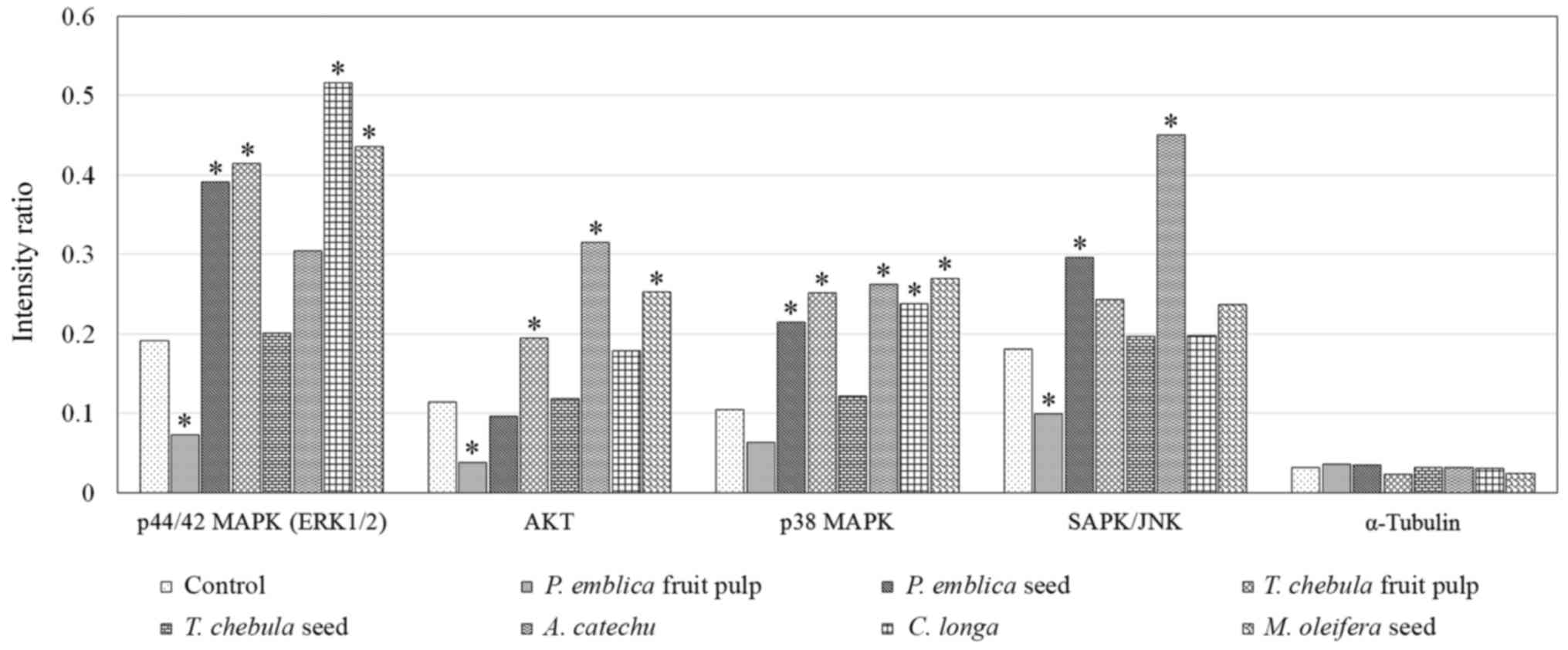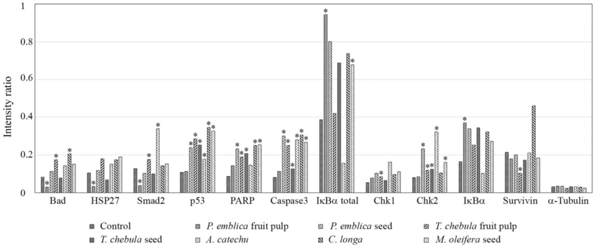 The present study investigated the inhibition of CCA cell proliferation by various types of medicinal plants. Each plant extract was composed of mixture of bioactive compounds (19); however, the current study evaluated the activity of the entire extract rather than the activities of the individual compounds. Inhibition of CCA cell proliferation was associated with the upregulation of numerous intracellular signaling molecules and pro-apoptotic molecules. A total of 19 signaling molecules involved in the regulation of the stress response and apoptosis were simultaneously detected in the present study.