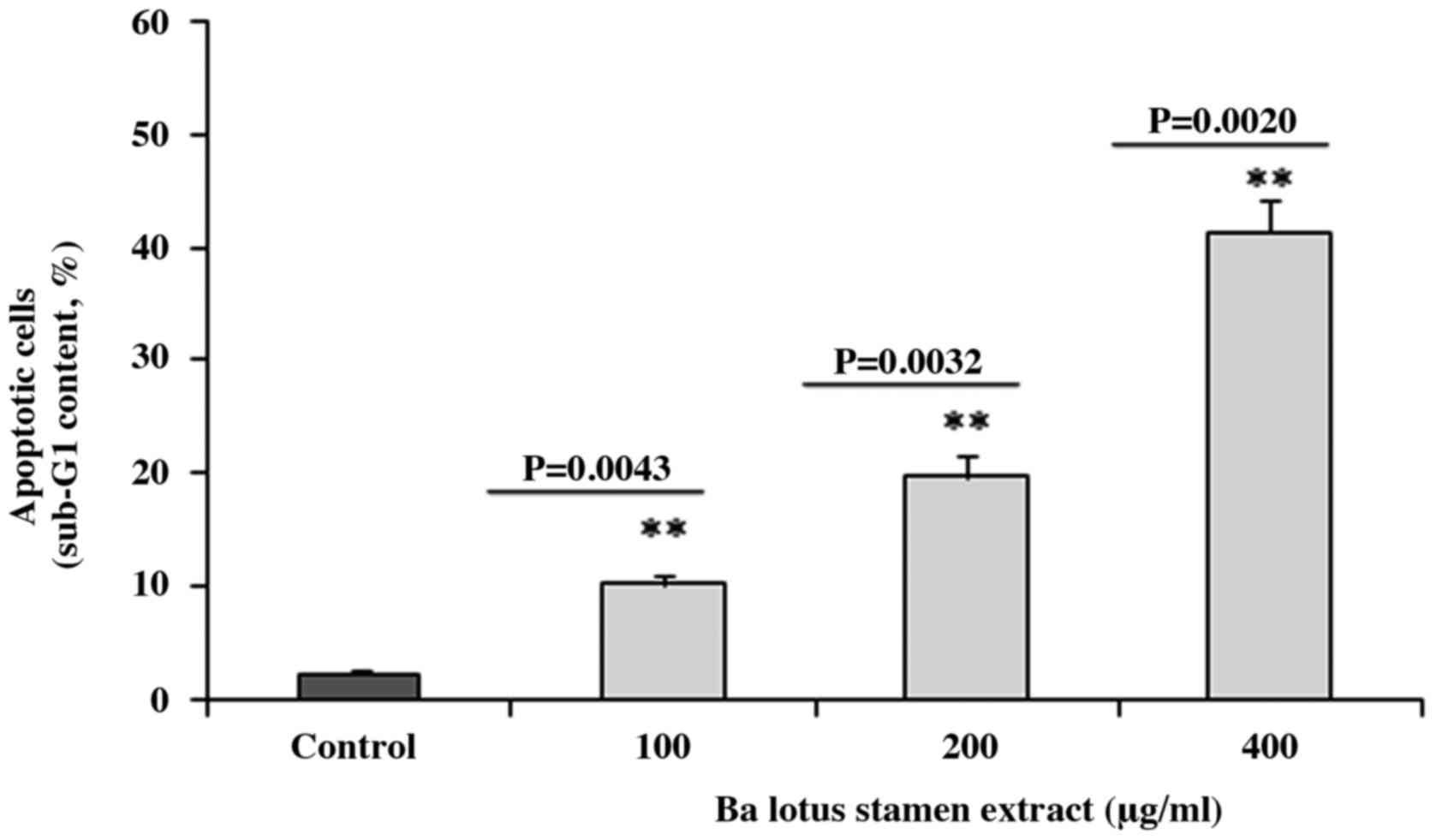 Table II.Growth inhibition of human HCT-116 colon cancer cells by Ba lotus stamen extract as evaluated by MTT assay. |