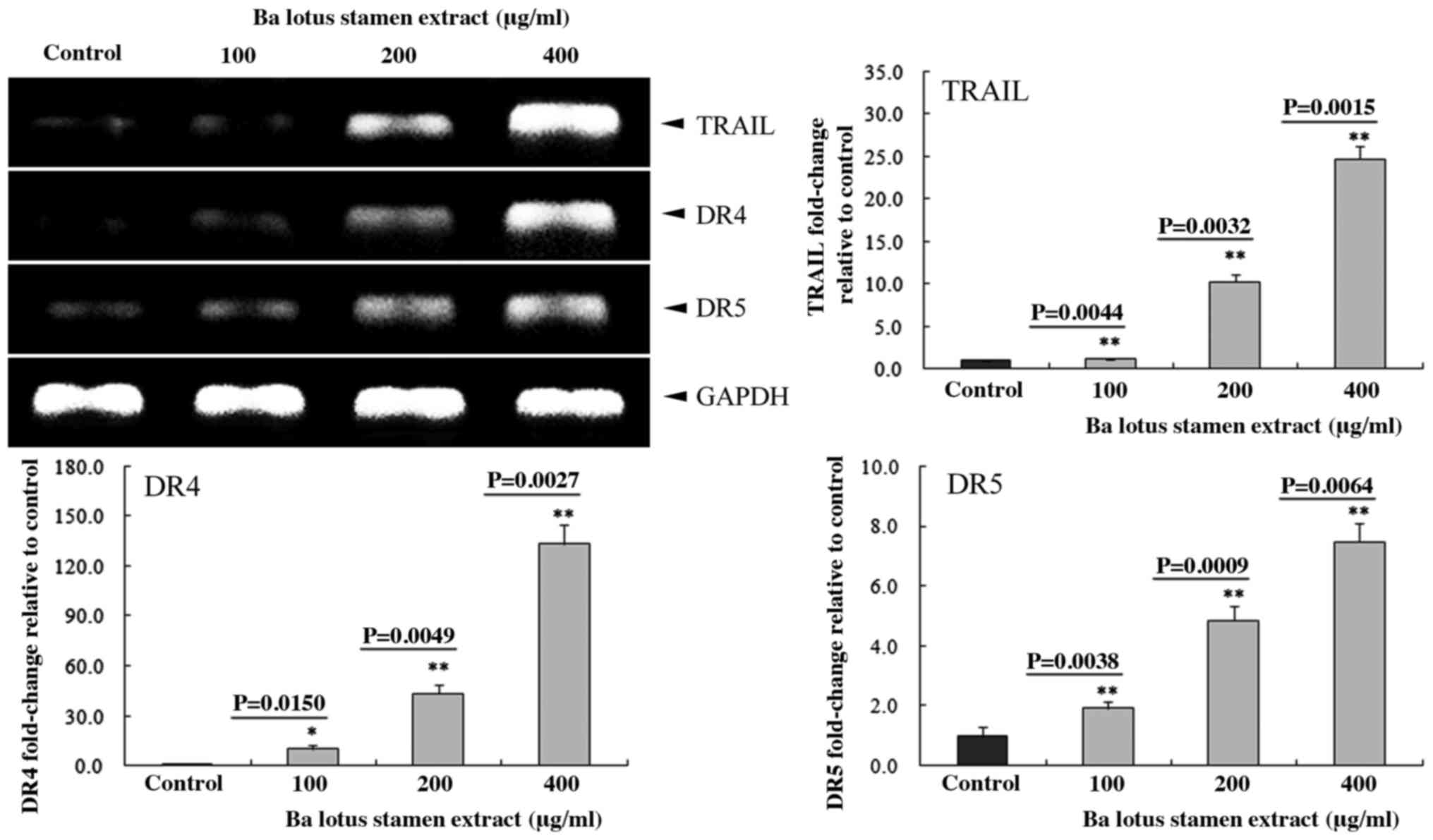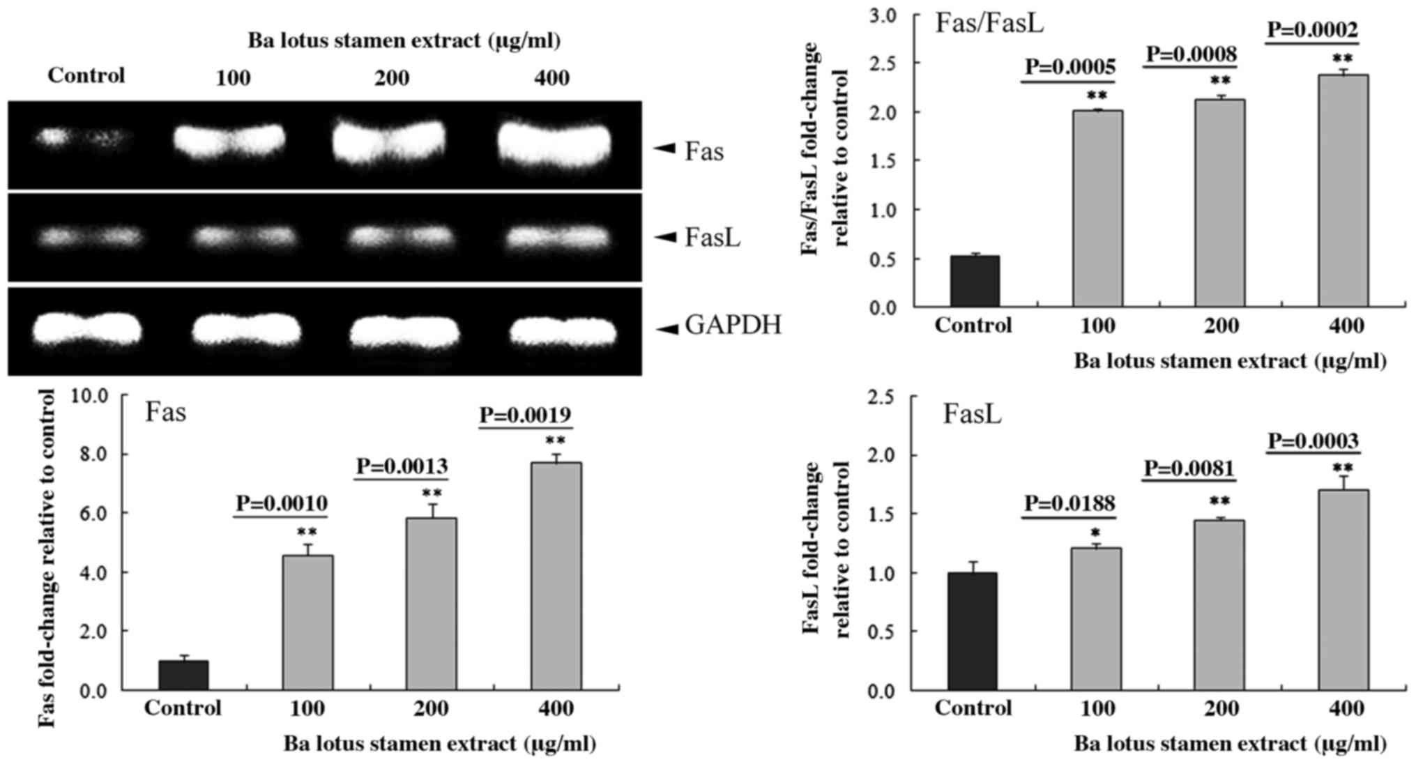 Following treatment with various doses of BLSEE, the mRNA levels of Fas (P=0.0019 at 400 µg/ml) and FasL (P=0.0003 at 400 µg/ml) were upregulated in HCT-116 cells (Fig. 2). In addition, 400 µg/ml of BLSEE significantly upregulated the mRNA levels of TRAIL (24.7-fold; P=0.0015), DR4 (133.2-fold; P=0.0027) and DR5 (7.5-fold; P=0.0064) compared with non-treated HCT-116 cells (Fig. 3).