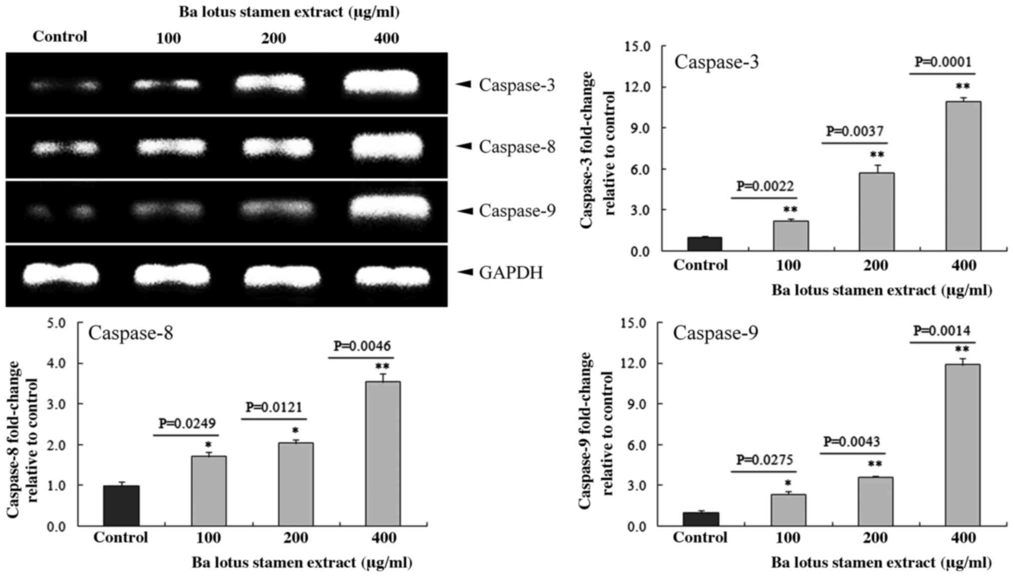 The effect of BLSEE on the mRNA caspase family, including caspases 3, 8 and 9 in HCT-116 colon cancer cells was determined by RT-PCR assay. BLSEE treatment significantly increased the mRNA expressions of these caspases in HCT-116 cells in a dose-dependent manner (Fig. 4). The highest dose (400 µg/ml) of BLSEE also increased the mRNA levels of caspase-3 (10.9-fold; P=0.0001), caspase-8 (3.5-fold; P=0.0046) and caspase-9 (11.9-fold; P=0.0014) compared to the non-treated HCT-116 cells.