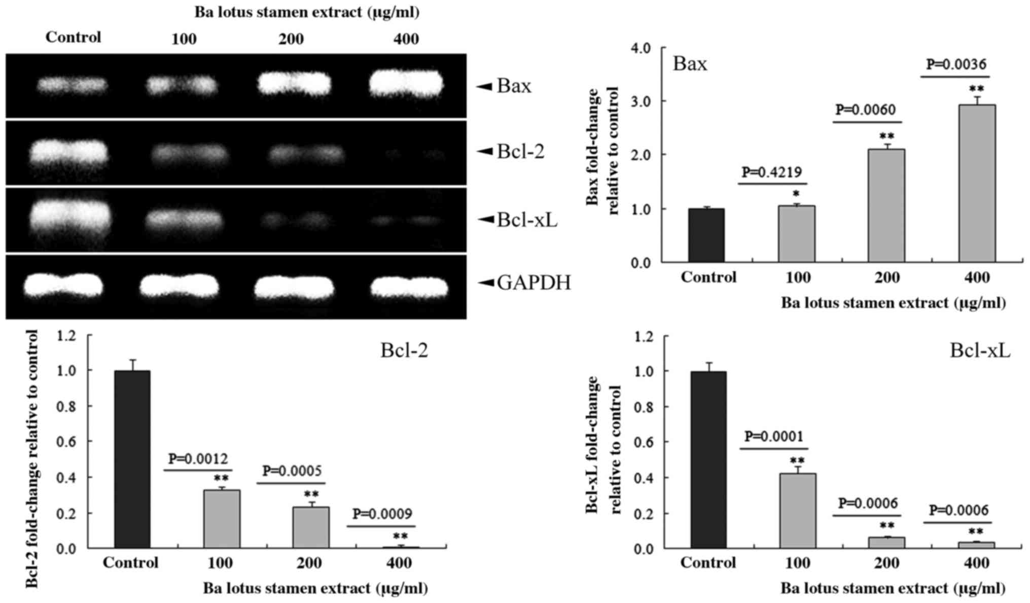 As shown in Fig. 5, BLSEE treatment dose-dependently reduced the expression of Bcl-2 and Bcl-xL in HCT-116 cells. At the highest dose of 400 µg/ml, BLSEE significantly reduced the mRNA levels of Bcl-2 (98.9%; P=0.0009) and Bcl-xL (96.3%; P=0.0006) compared to the non-treated HCT-116 cells, respectively. By contrast, 400 µg/ml of BLSEE also enhanced the Bax levels of mRNA (2.9-fold; P=0.0036) compared to non-treated HCT-116 cells.