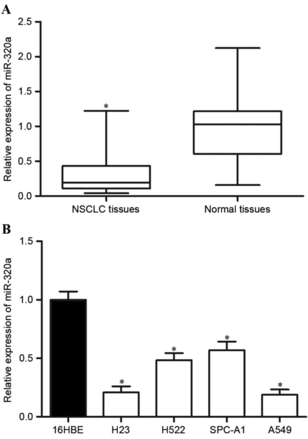In the present study, the expression level of miR-320a in NSCLC tissues and cell lines was determined, and the functions of miR-320a in NSCLC cells was evaluated. Furthermore, the molecular mechanisms underlying its functions in NSCLC cells were also investigated.