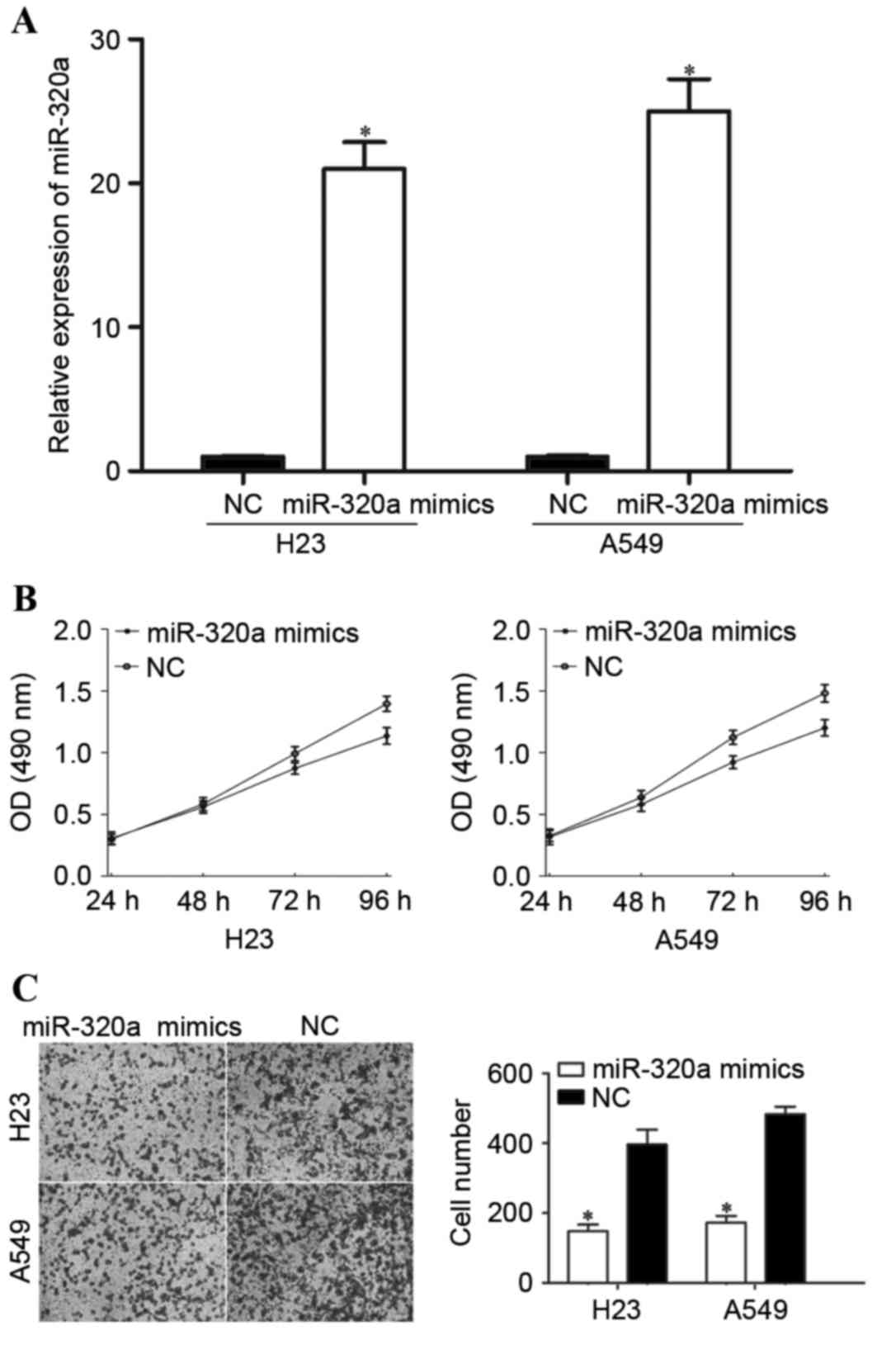 In order to investigate the functions of miR-320a in NSCLC, H23 and A549 cells were transfected with miR-320a mimics or NC. The efficiency of the transfection was determined by RT-qPCR. As demonstrated in Fig. 2A, miR-320a was significantly upregulated in miR-320a mimic-transfected H23 and A549 cells compared with cells transfected with NC.