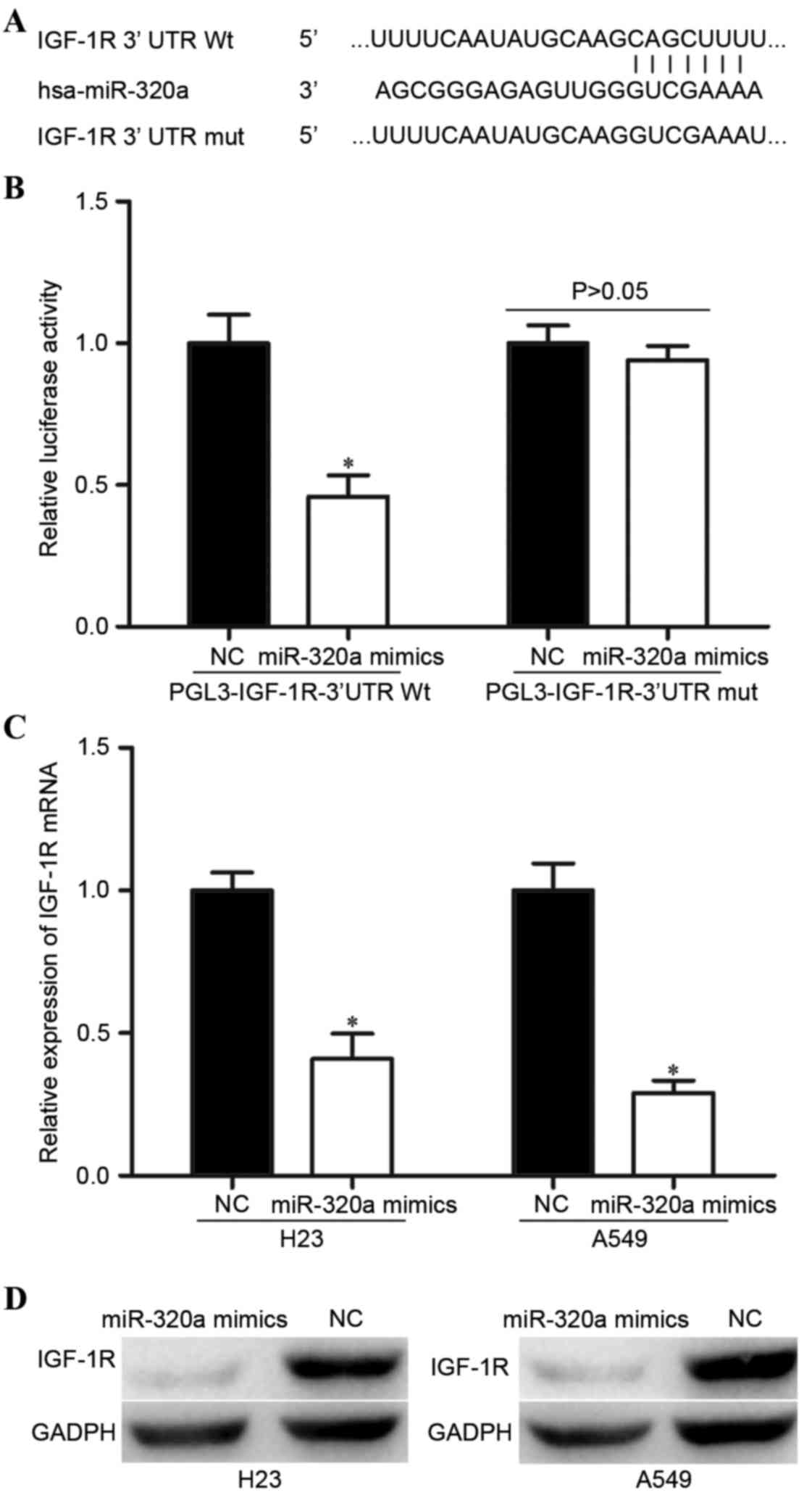 Identification of cancer-specific miRNAs, in addition to their target genes, is important for elucidating the functions of miRNAs in carcinogenesis and may provide promising therapeutic targets. In the present study, IGF-1R was identified as a direct target gene of miR-320a in NSCLC cells. Firstly, it was revealed that miR-320a could target the 3′UTR sequence of IGF-1R by performing bioinformatic analysis. Furthermore, the luciferase reporter assay demonstrated that miR-320a suppressed the luciferase activity in cells transfected with PGL3-IGF-1R-3′UTR Wt compared with PGL3-IGF-1R-3′UTR Mut, indicating that miR-320a directly targeted the 3′UTR of IGF-1R. Additionally, the overexpression of miR-320a reduced the IGF-1R expression level in NSCLC cells at the mRNA and protein levels. Finally, knockdown of IGF-1R by siRNA had similar effects compared with miR-320a overexpression in NSCLC cells, which demonstrated that IGF-1R was the direct functional target of miR-320a in NSCLC cells. IGF-1R is a transmembrane tyrosine kinase receptor that contains two extracellular α subunits and two transmembrane β subunits (27). Previous functional studies have revealed that IGF-1R serves important functions in numerous cancer-associated biological processes, including cell proliferation, anti-apoptosis, vascularization, migration, invasion and metastasis (36,37). Together these findings suggested that IGF-1R is worth paying close attention to as a potential target for the inhibition of NSCLC.