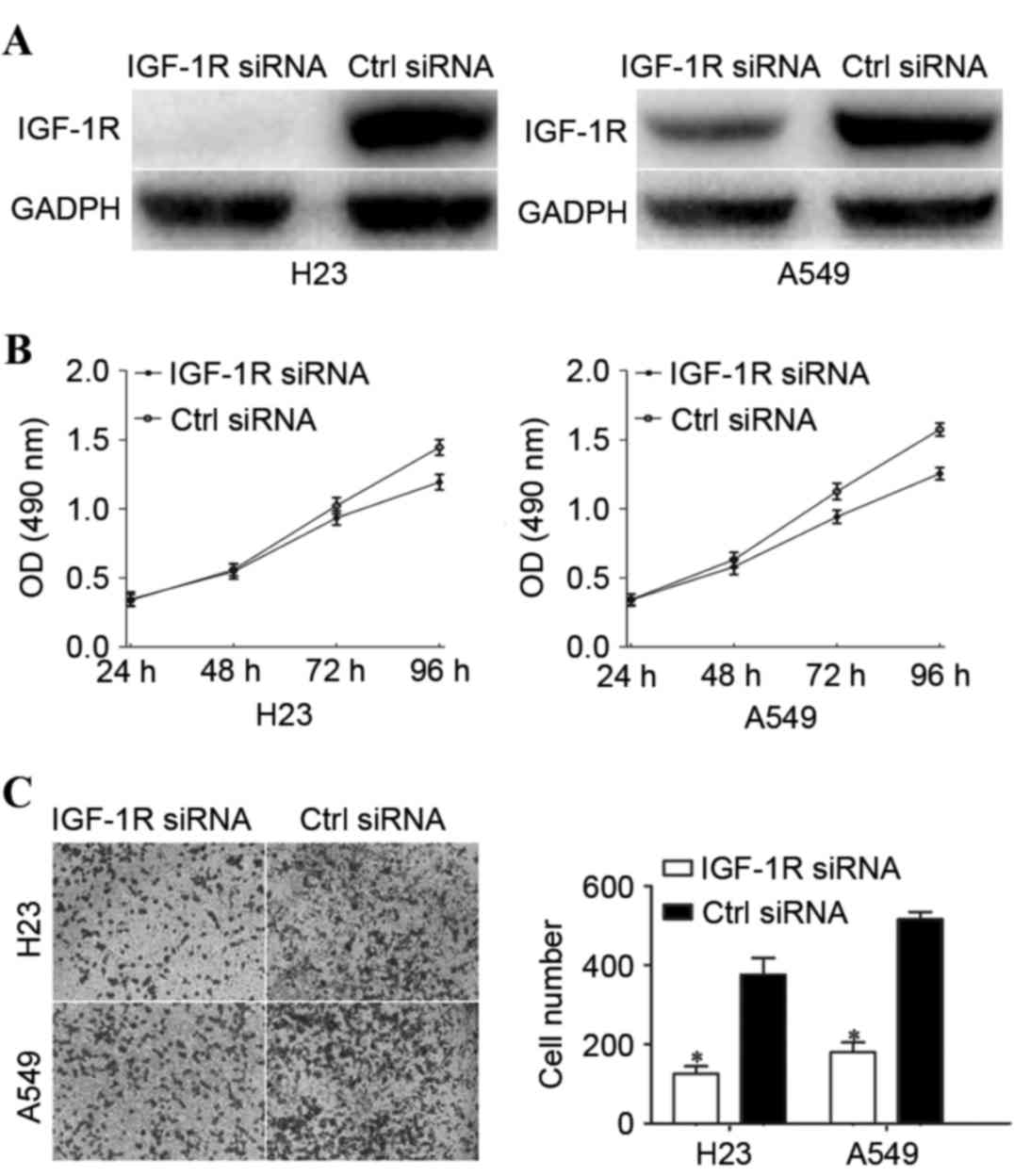 In order to investigate whether the functions of miR-320a on NSCLC cells were dependent on IGF-1R, the H23 and A549 cells were transfected with IGF-1R siRNA or ctrl siRNA, followed by evaluation by cell proliferation and Transwell cell invasion assays. Firstly, western blot analysis was performed to determine the transfection efficiency. As presented in Fig. 4A, the IGF-1R expression level was decreased in the H23 and A549 cells following transfection with IGF-1R siRNA. Furthermore, cell proliferation and Transwell cell invasion assays revealed that IGF-1R-knockdown significantly suppressed cell proliferation (Fig. 4B) and invasion (Fig. 4C), compared with the ctrl siRNA groups. These results indicated that the functions of IGF-1R downregulation were similar to the functions induced by miR-320a overexpression in NSCLC cells, rendering IGF-1R as a direct functional target of miR-320a in NSCLC cells.