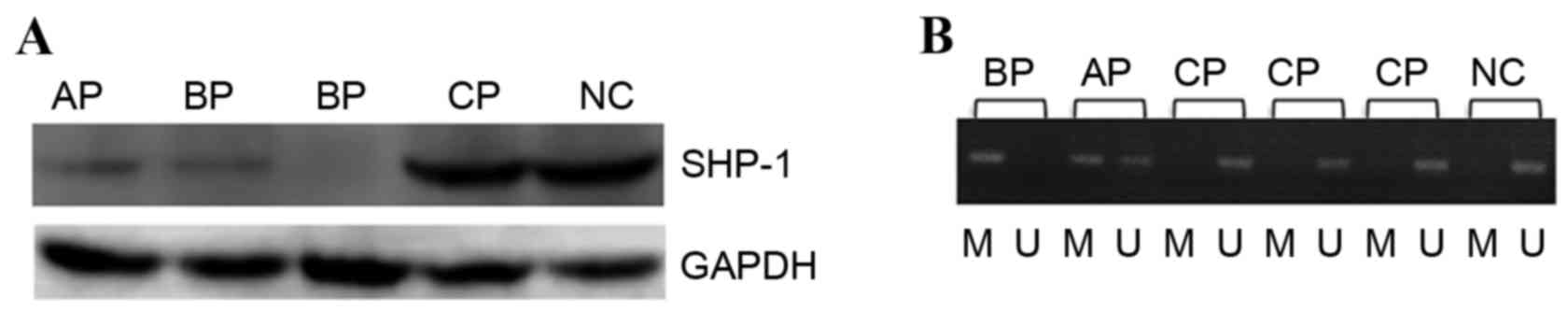 Methylation in the promoter regions of tumor suppressor genes leads to tumor formation (9,10). The tyrosine phosphatase SHP1 is a key negative regulator of intracellular signalling and is hypothesised to be a tumor suppressor gene. The methylation status of the SHP1 promoter is associated with gene dormancy, which is an important mechanism in the development of lymphoma and leukaemia. SHP1 protein expression was completely absent or partially reduced in the majority of types of lymphoma and leukaemia cell lines, such as YS2, IWA3, NK, TomJim, MTI, EDS, and ATLIK (11,12). The present study demonstrated the lack of SHP1 expression in K562 cells. However, the SHP1 gene promoter was highly methylated. The degree of SHP1 promoter methylation increased with decreasing SHP1 expression in patients with CML-BP. In contrast, the degree of SHP1 promoter methylation decreased with increasing SHP1 expression in patients with CML-CP. These data suggested that the SHP1 gene methylation status in patients with CML-BP may be associated with the disease progression of CML.