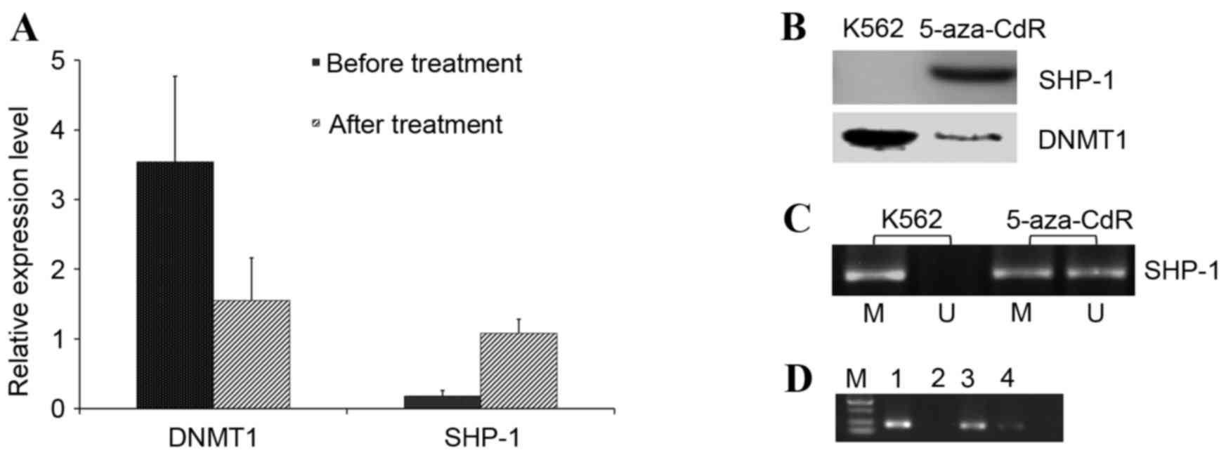 A similar pattern of the levels of SHP1 and DNMT1 expression was observed at the protein level, as demonstrated in Fig. 2B. In addition, subsequent to the application of decitabine, the methylation level of the SHP1 gene was decreased in the K562 cells, from complete methylation to partial methylation, as illustrated in Fig. 2C.