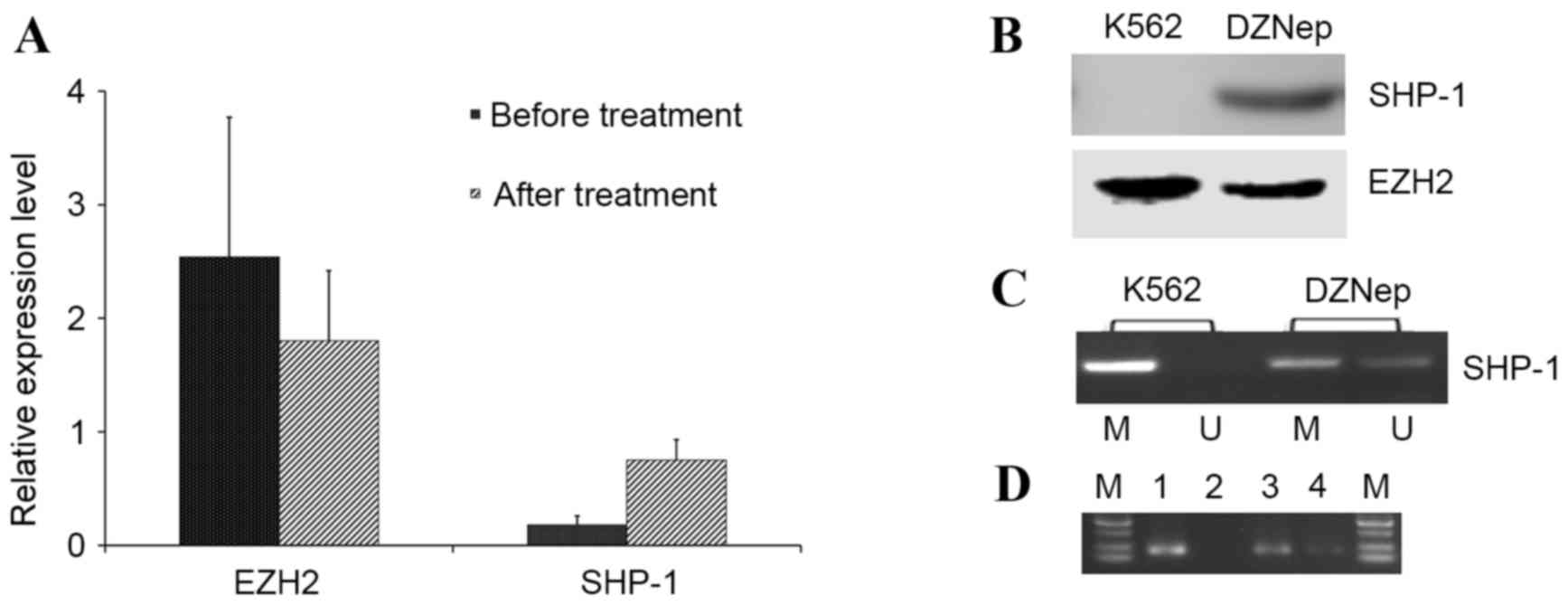 Based on the aforementioned previous data, including the high methylation of the SHP1 gene in patients with CML, it was hypothesised that EZH2 also participates in the process of SHP1 gene methylation. In the present study, a high level of methylation of the SHP1 gene in patients with CML-BP was detected. The methylation status of SHP1 decreased subsequent to the application of an inhibitor of EZH2. Therefore, assays were performed on K562 cells prior and subsequent to treatment with an inhibitor of EZH2. The SHP1 gene promoter was revealed to enrich binding to EZH2. Subsequent to drug intervention, the interaction of EZH2 with the promoter of SHP1 weakened, and the methylation status of SHP1 reduced. Therefore, it was hypothesised that EZH2 and DNMT1 are involved in SHP1 gene methylation, which may be associated with the progression of CML.