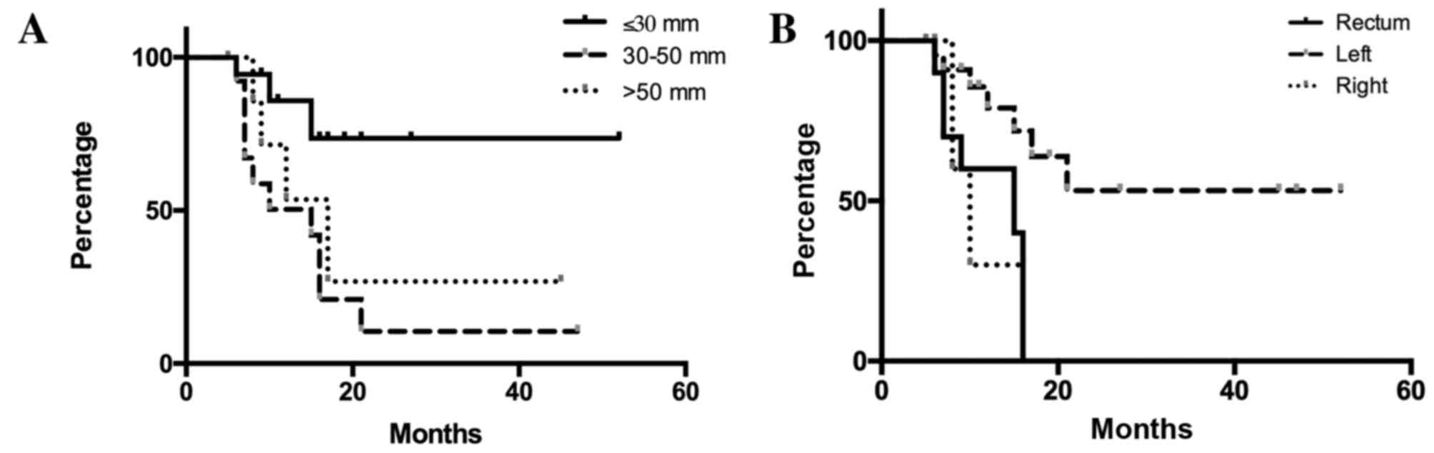 In all 39 liver metastases, the local control rates were 67.2 and 35.9% after 1 and 2 years, respectively (Fig. 1). When patients were divided into three groups based on tumor size (maximum diameter of GTV, ≤30, 30–50 and >50 mm), patients with tumors ≤30 mm in maximum diameter had significantly improved local control compared with the other two groups (Fig. 2A). When patients were stratified according to the primary tumor, defined as right-sided colon (cecum, ascending and transverse colon), left-sided colon (descending, sigmoid and rectosigmoidal) or rectal cancers, liver metastases from rectal cancer were shown to be associated with a significantly poorer local control rate compared with those from the left-sided colon (Fig. 2B).