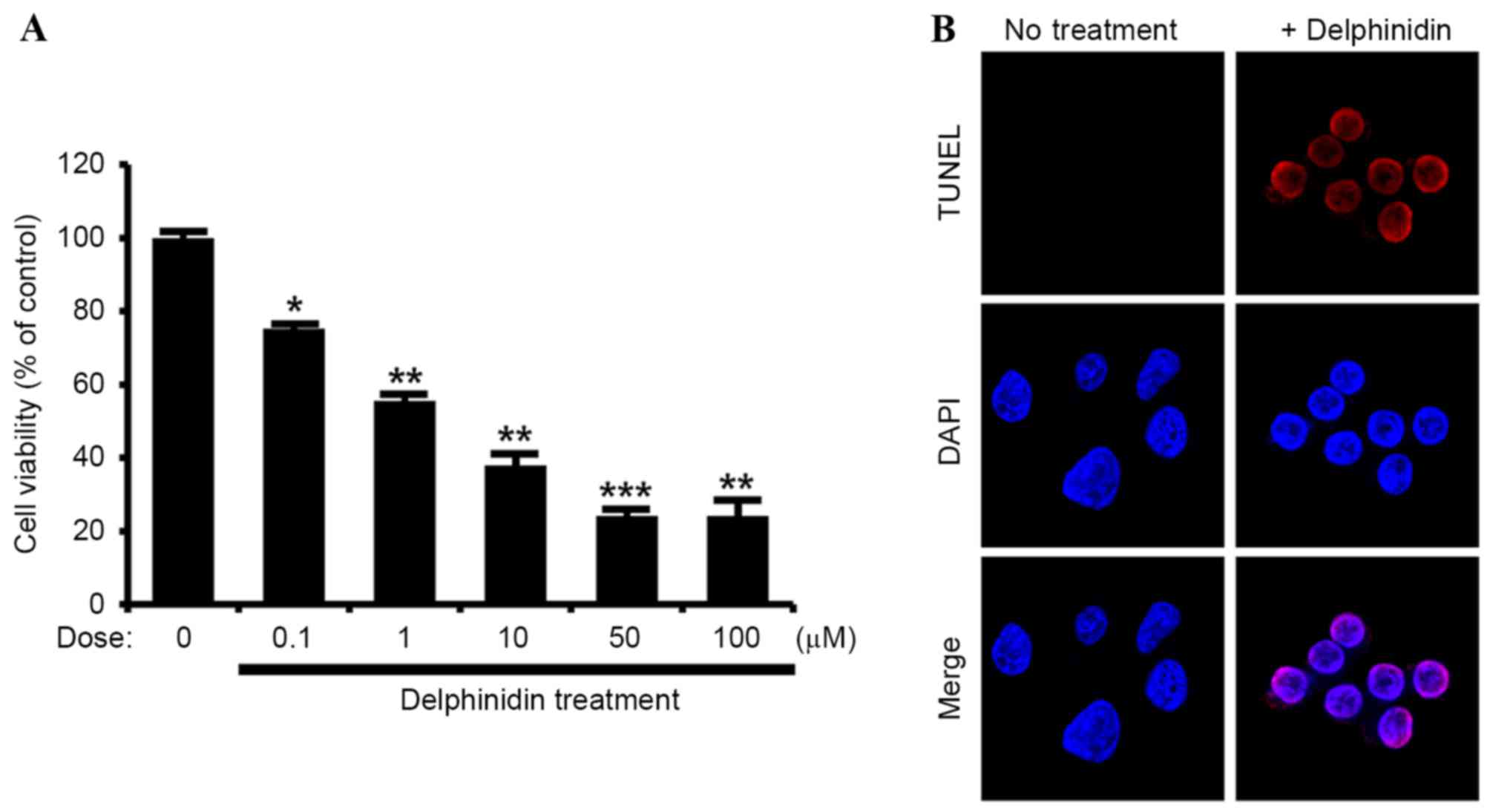 The SKOV3 cells (3×104 cells/300 µl) were seeded onto confocal dishes (catalog no. 100350; SPL Life Sciences Co., Ltd., Pocheon, Korea) and then incubated for 24 h at 37°C in serum-free McCoy's 5A. The cells were subsequently treated with delphinidin at a final concentration of 10 µM in 10 ml for 48 h at 37°C in a CO2 incubator. Following incubation, the cells were subjected to TUNEL staining using an in situ Cell Death Detection kit, TMR red (Roche Diagnostics) according to the manufacturer's protocol. Fluorescence was detected using an LSM 710 (Carl Zeiss AG, Oberkochen, Germany) confocal microscope at magnifications 40x and 80x fitted with a digital microscope AxioCam camera and using Zen 2009 software (Carl Zeiss AG). These experiments were performed in triplicate.