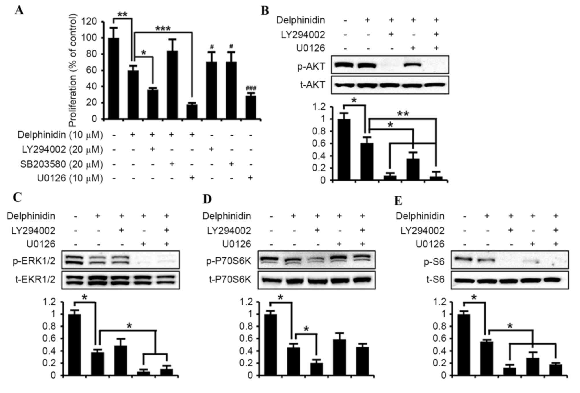 It was examined whether the delphinidin-suppressed proliferation of SKOV3 cells is associated with the PI3K/AKT, ERK1/2 MAPK and P38 MAPK signal transduction pathways. Cell proliferation assays were conducted in the absence or presence of delphinidin (10 µM), LY294002 (20 µM; PI3K inhibitor), SB203580 (20 µM; P38 MAPK inhibitor) and U0126 (10 µM; ERK1/2 MAPK inhibitor; Fig. 3A). Compared with non-treated SKOV3 cells, delphinidin inhibited the proliferation of SKOV3 cells by ~40% (P<0.01). Treatment of SKOV3 cells with LY294002 or U0126 alone decreased cell proliferation by ~30% (P<0.05) and 70% (P<0.001), respectively. In addition, the co-incubation of LY294002 (P<0.05) and U0126 (P<0.001) with delphinidin exhibited a synergistic effect to inhibit the proliferation of SKOV3 cells, as compared with delphinidin or pharmacological inhibitor alone. However, no significant effect of SB203580 on the anti-proliferative effects of delphinidin on SKOV3 cells was observed, whereas SB203580 alone slightly reduced the viability of SKOV3 cells. Thus, the expression of target signaling proteins in response to the blockage of PI3K/AKT and ERK1/2 MAPK transduction pathways was investigated using LY294002 or U0126 in order to identify those cell signaling pathways mediated by delphinidin. As illustrated in Fig. 3B, the suppression of AKT in SKOV3 cells was markedly inhibited by combined treatment with LY294002 and delphinidin, and with U0126 and delphinidin, respectively. The levels of phosphorylated ERK1/2 proteins in SKOV3 cells were significantly reduced by administering delphinidin alone (P<0.05; Fig. 3C). In addition, treating cells with a combination of delphinidin with U0126 highly suppressed the abundance of phosphorylated ERK1/2 protein in SKOV3 cells compared with cells treated with delphinidin alone. By contrast, treatment with delphinidin and LY294002 did not result in a significant decrease in the levels of phosphorylated ERK1/2 compared with treatment with dephinidin alone (Fig. 3C). The phosphorylation of P70S6K was also inhibited (P<0.05) in SKOV3 cells when treated with a combination of LY294002 and delphinidin, but not in cells treated with a combination of U0126 and delphinidin (Fig. 3D). Additionally, pattern of changes in the level of phospho-proteins in response to each treatment in SKOV3 cells were similar for phospho-S6 and phospho-AKT (Fig. 3E). These results indicate that the inactivation of PI3K/AKT and EKR1/2 MAPK signal transduction serves a crucial role in delphinidin-induced suppression of SKOV3 cell proliferation.