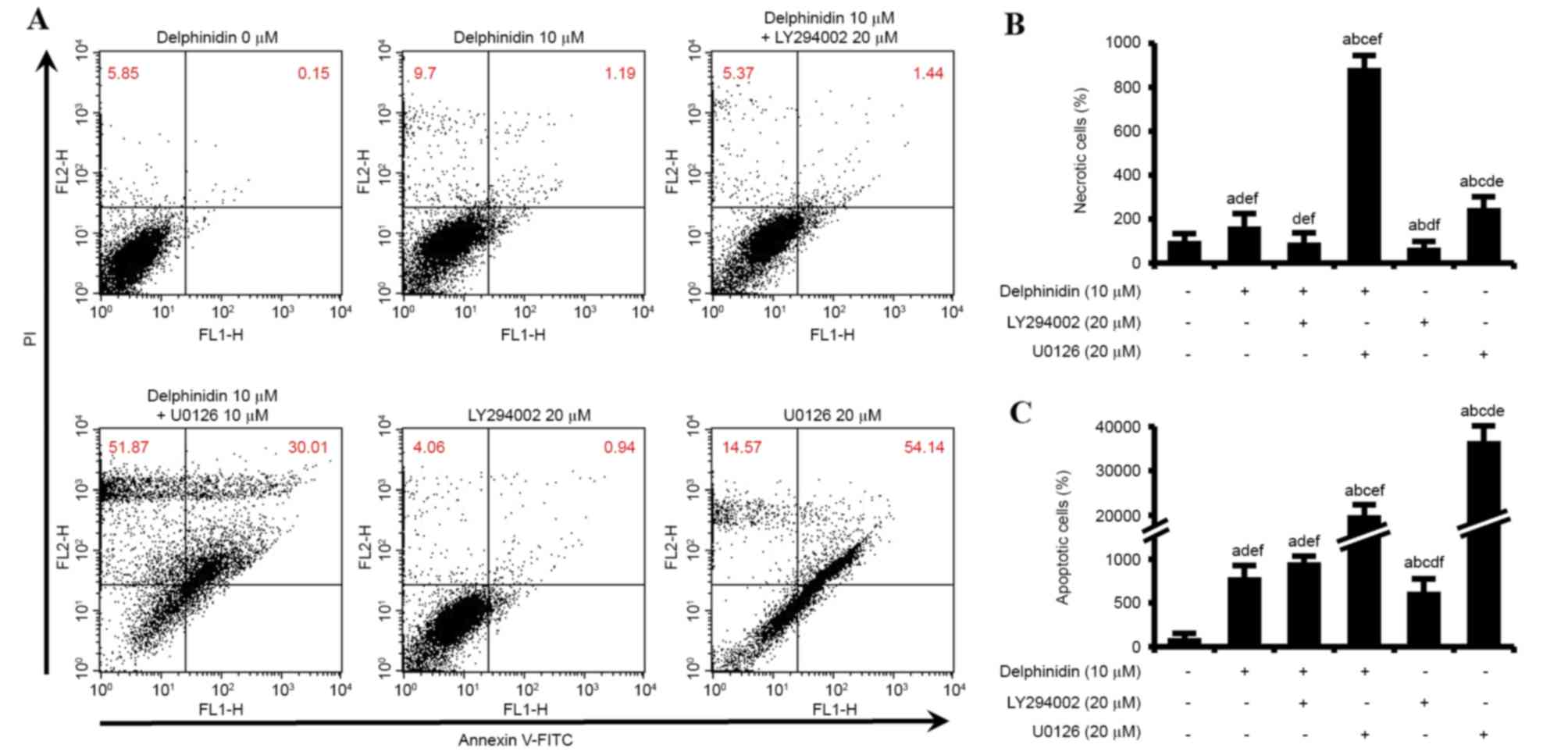 In order to compare the apoptotic effects of various drug treatments (10 µM delphinidin, 20 µM LY294002, 10 µM U0126 and a combination of 10 µM delphinidin with each inhibitor) in SKOV3 cells, Annexin V/PI staining and cell cycle assays were performed. As illustrated in Fig. 4A, the number of necrotic (upper left quadrant) and apoptotic (upper right quadrant) SKOV3 cells in response to various drug treatments were investigated by Annexin V-FITC and PI flow cytometry. The number of necrotic SKOV3 cells increased by 165%, as compared with the number of cells in the control cell group (Fig. 4B). In addition, a combination of delphinidin and U0126 increased the abundance of necrotic SKOV3 cells by ~886%, compared with non-treated SKOV3 cells. This necrotic effect on SKOV3 cells was greater than that observed for delphinidin or U0126 treatment alone. However, delphinidin in combination with LY294002 only slightly enhanced the necrosis of SKOV3 cells, as compared with LY294002 administered alone. Delphinidin significantly increased the rate of apoptosis in SKOV3 cells (793%, P<0.05), compared with non-treated SKOV3 cells (Fig. 4C). In addition, the combination of delphinidin and LY294002 increased the number of apoptotic cells to a greater extent than that observed with delphinidin or LY294002 alone. Furthermore, the apoptosis of SKOV3 cells was significantly increased by treatment with U0126. These results indicate that the inhibition of PI3K/AKT and ERK1/2 MAPK signaling pathways in SKOV3 cells treated with delphinidin induces necrosis and apoptosis.