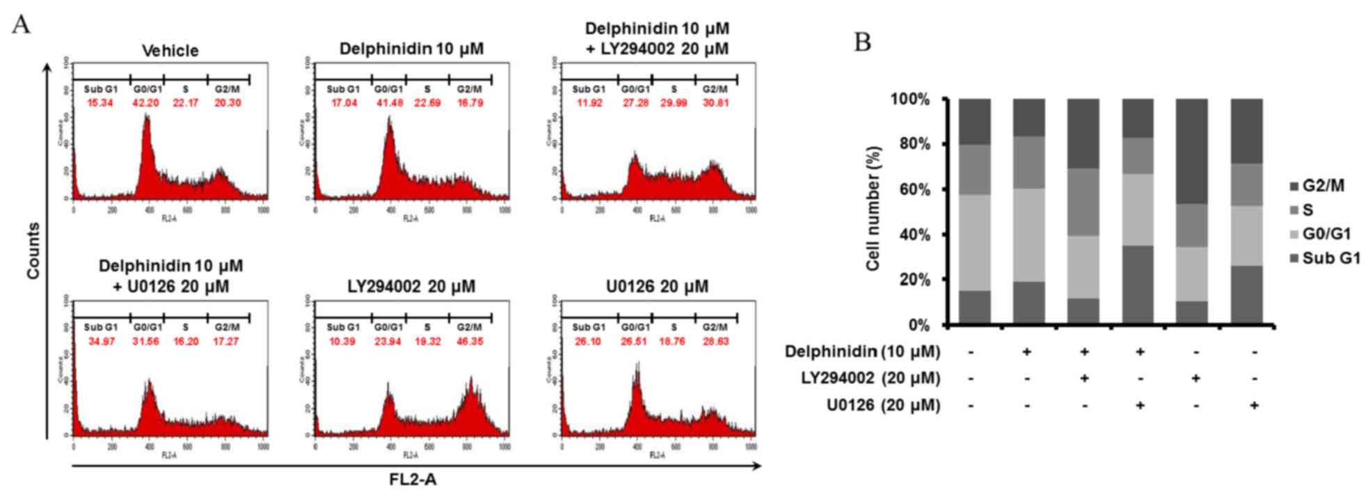 To determine the regulatory effects of delphinidin and pharmacological inhibitors on the cell cycle distribution of SKOV3 cells, cell cycle assays were conducted via quantitation of DNA content using PI and flow cytometry (Fig. 5). Delphinidin increased the number of cells in the sub-G1 phase, whereas the proportions of SKOV3 cells in the G0/G1 and G2/M phases were decreased following treatment with delphinidin due to cell cycle arrest, compared with non-treated cells. In addition, the treatment of SKOV3 cells with an ERK1/2 MAPK inhibitor (U0126) increased the proportion of cells in the sub-G1 phase compared with non-treated cells. There was a greater increase in the number of SKOV3 cells in the sub-G1 phase when treated with a combination of delphinidin and U0126 compared with treating with delphinidin or U0126 alone. In addition, LY294002 administered alone and in combination with delphinidin increased the proportion of SKOV3 cells in the S and G2/M phases, as compared with SKOV3 cells treated with delphinidin alone. These results indicate that delphinidin stimulates the apoptosis of SKOV3 cells by inducing cell cycle arrest and that a combination of delphinidin and U0126 primarily induces sub-G1 phase arrest in SKOV3 cells.