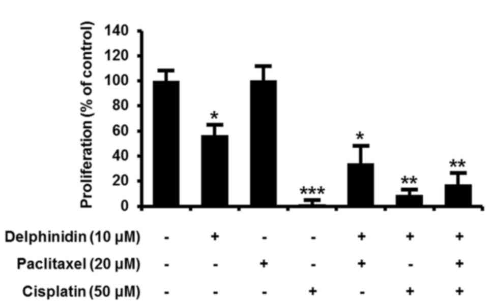 To investigate chemotherapeutic effects of delphinidin on the proliferation of SKOV3 cells compared with conventional chemotherapy, the therapeutic efficacy of 10 µM delphinidin, 20 µM paclitaxel (a taxane-based drug) and 50 µM cisplatin (a platinum-based drug) alone and in combination were assessed (Fig. 6). Monotherapy using delphinidin or cisplatin inhibited the proliferation of SKOV3 cells by 44% (P<0.05) and 95% (P<0.001), respectively. By contrast, the SKOV3 cells were not affected by paclitaxel treatment alone. In comparison with paclitaxel monotherapy, the proliferation of SKOV3 cells was markedly decreased by delphinidin plus paclitaxel. These results indicate that co-treatment with delphinidin and paclitaxel effectively increases the chemotherapeutic activity of paclitaxel monotherapy in SKOV3 cells.