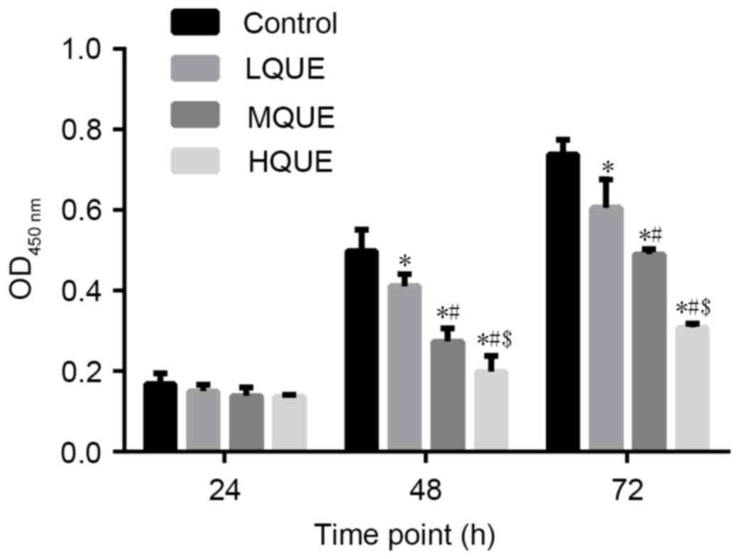 The viability of Y79 cells subsequent to being subjected to Que was examined by CCK-8 assay. A decrease in cell viability due to Que administration was observed for cells sampled from 48 and 72 h (Fig. 1). The difference between the control group and the MQUE group or the control group and the LQUE group was statistically significant for the last two time points (P<0.05). In addition, Que affected Y79 cells in a dose-dependent manner, with 100 Μm Que causing the strongest inhibitory effect on the proliferation of Y79 cells. The differences between the LQUE and HQUE groups, the LQUE and MQUE groups, and the MQUE and HQUE groups were all statistically significant for the last two time points (P<0.05).