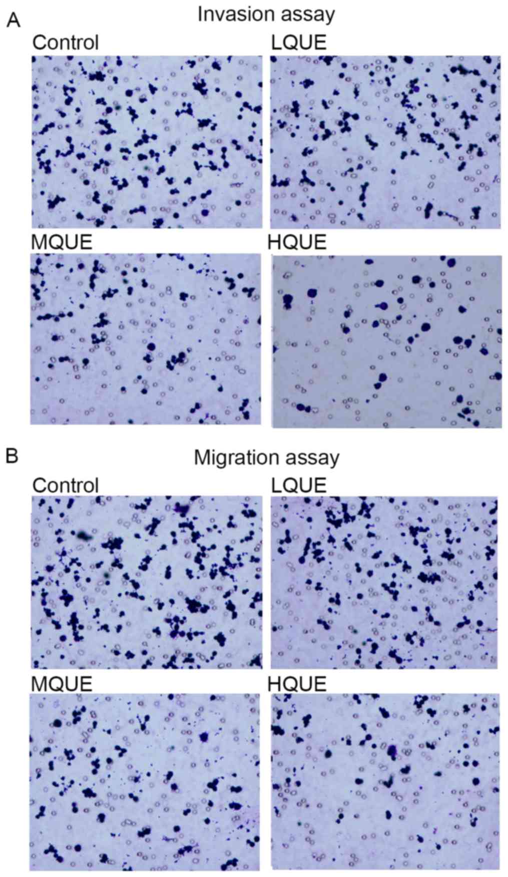 Migration and invasion of Y79 cells was detected using Transwell experiments. Exposure to Que markedly reduced the cell numbers moving through the porous membranes (Fig. 2A and B), representing the potential of Y79 to inhibit the metastasis of RB.