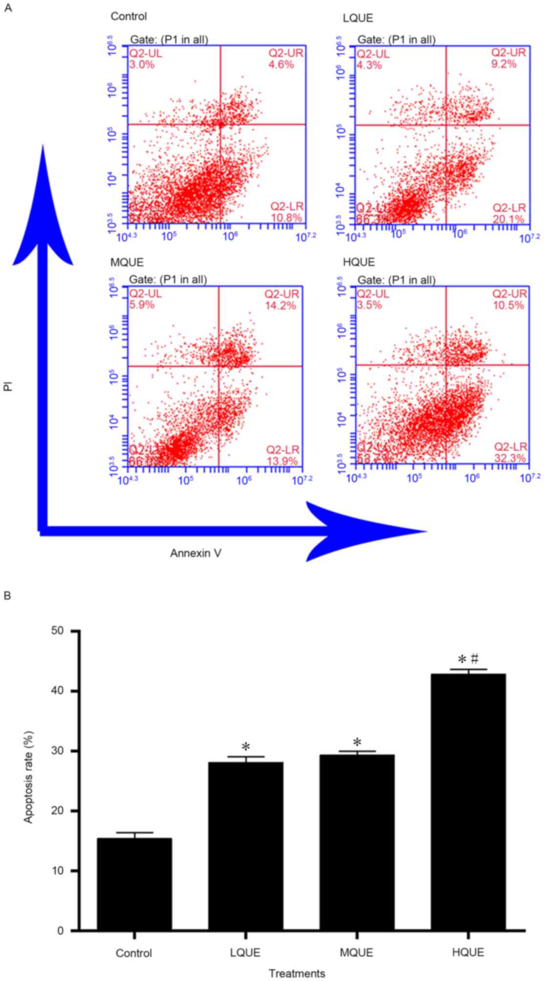 The apoptotic process in Y79 cells was also induced by Que administration (Fig. 3). Apoptotic rate of the control group (15.4±1.0%) was significantly different from the other three groups (28.1±0.9% for the LQUE group, 29.3±0.7% for the MQUE group and 42.8±0.8% for the HQUE group) (P<0.05). The effect of Que on the apoptosis of Y79 cells was also dose-dependent, but only the data of the HQUE group was significantly increased compared with the other two groups (P<0.05).