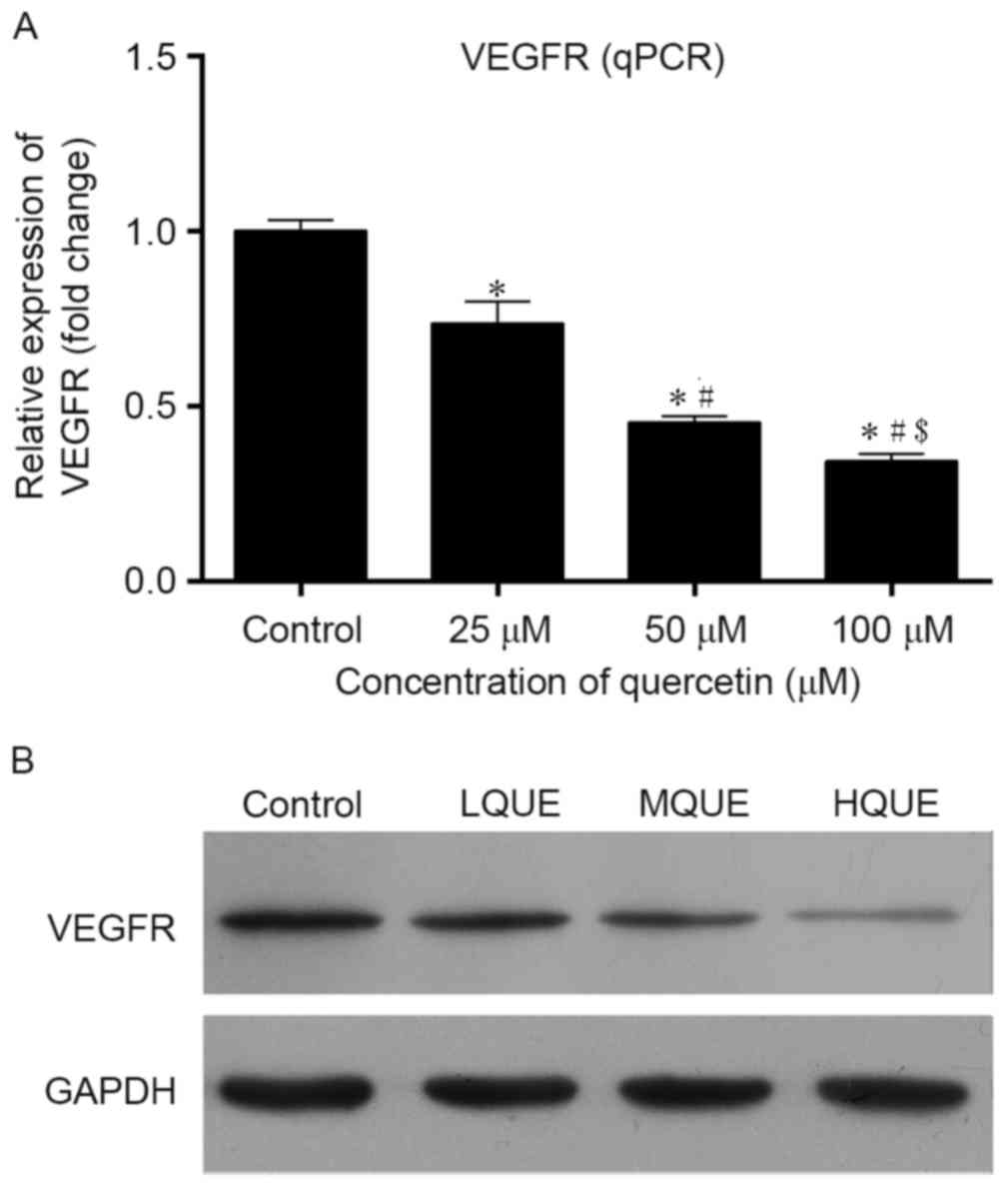 Among types of pro-angiogenic mechanisms, the VEGF signaling pathway has been implicated as the central mediator of tumor neovascularization (34). As an attractive therapeutic target, VEGF has been demonstrated to be associated with initiation of angiogenesis by regulating proliferation, migration and differentiation of endothelial cells (35). The function of VEGF is mediated through the activation of receptor tyrosine kinases. In the present study, Que significantly inhibited the level of VEGFR in Y79 cells, which represented the blockade of the VEGF signaling pathway. The present data reported a similar result to a previous study by Pratheeshkumar et al (20) based on prostate cancer, in which the authors reported that Que administration inhibited the activation of VEGFR2, and thereby suppressed the downstream Akt/mechanistic target of rapamycin/P70S6K-mediated angiogenesis signal transduction pathways. A dose-dependent effect of Que on RB cells and VEGFR expression was also observed. However, the suitable concentration of Que for treating RB in the clinic requires additional study.