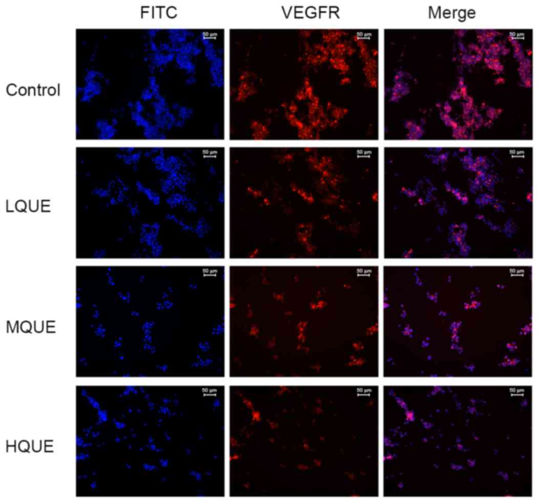 Expression of VEGF in Y79 cells post-Que administration was detected using RT-qPCR, western blotting and immunofluorescence assay. At the mRNA level, treatment of Que reduced the transcription of VEGFR, and the differences between the control group and the other three groups were all statistically significant (P<0.05; Fig. 4A). In addition, the effect of Que on the transcription of VEGFR was also dose-dependent. Similar results were also detected for western blot analysis; Que administration inhibited the expression of VEGFR in a dose-dependent manner (Fig. 4B). For detection of the immunofluorescence assay, as shown in Fig. 5, VEGFR-positive cells were stained red and FITC-positive cells were stained blue. It was demonstrated that Que administration decreased the distribution and amount of VEGFR in Y79 cells. These results confirmed the antagonizing effect of Que on the process of angiogenesis in RB cells.