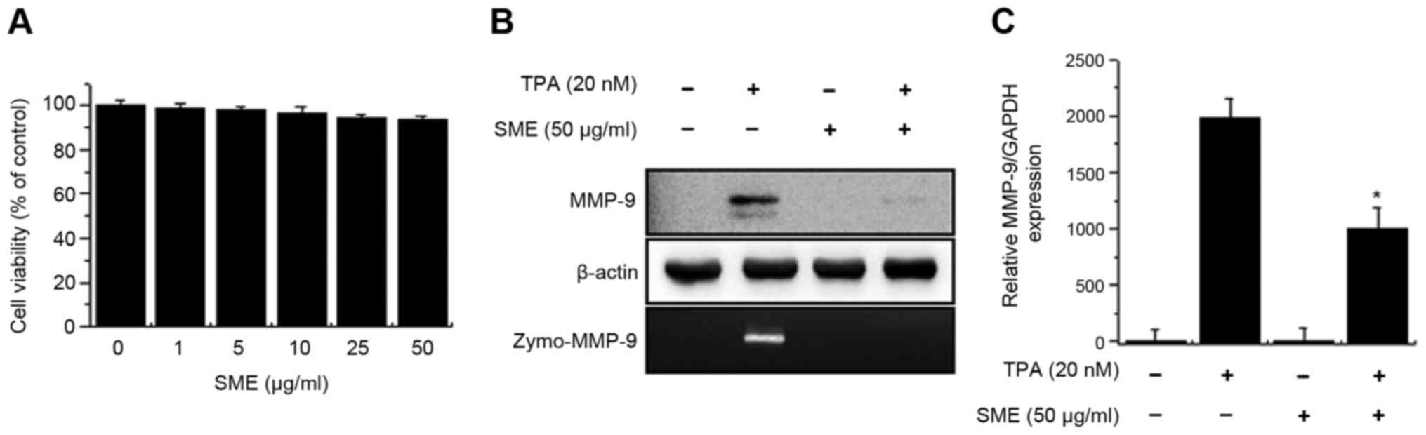 The treatment of cells with SME did not affect cell viability until concentrations reached 50 µg/ml (Fig. 1A). On that basis, an SME concentration of 50 µg/ml was used for subsequent experiments. In order to investigate the effect of SME on the expression of MMP-9, cells were pretreated with SME for 1 h and then incubated with TPA for 24 h at 37°C. TPA-mediated expression/secretion of MMP-9 was decreased by pre-treatment with SME (Fig. 1B). qPCR analysis revealed that SME significantly reduced the levels of MMP-9 mRNA expression induced by TPA (Fig. 1C).
