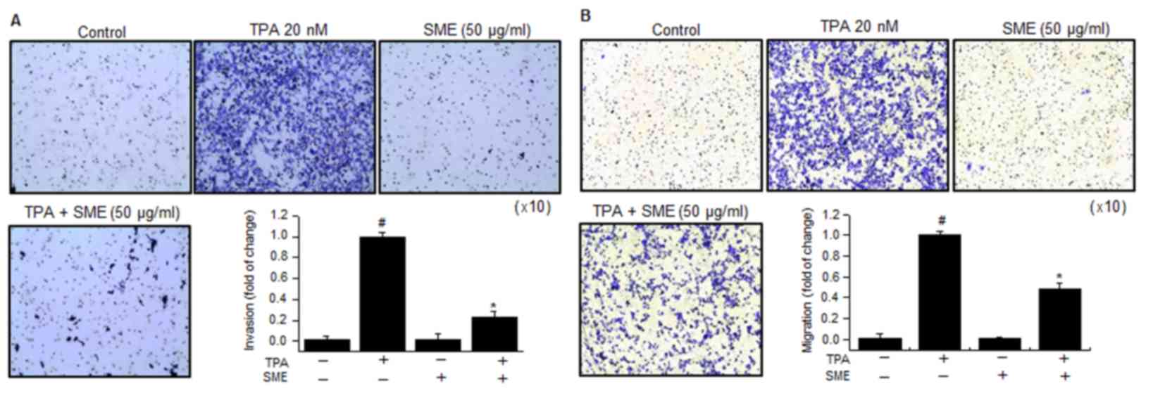 The invasion (35) and migration assays (37) were performed as previously described. Cell growth medium (0.5 ml) with cells was added to the upper chamber, and medium with TPA alone or with SME was added to bottom wells.