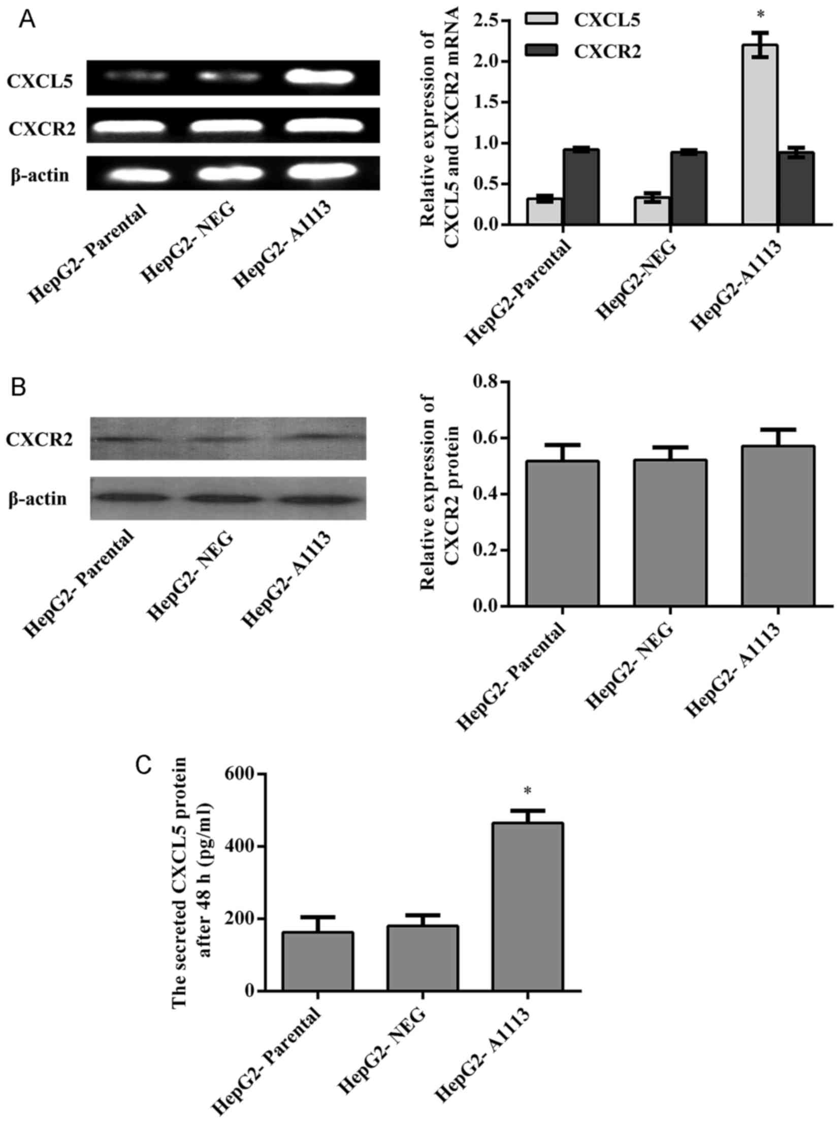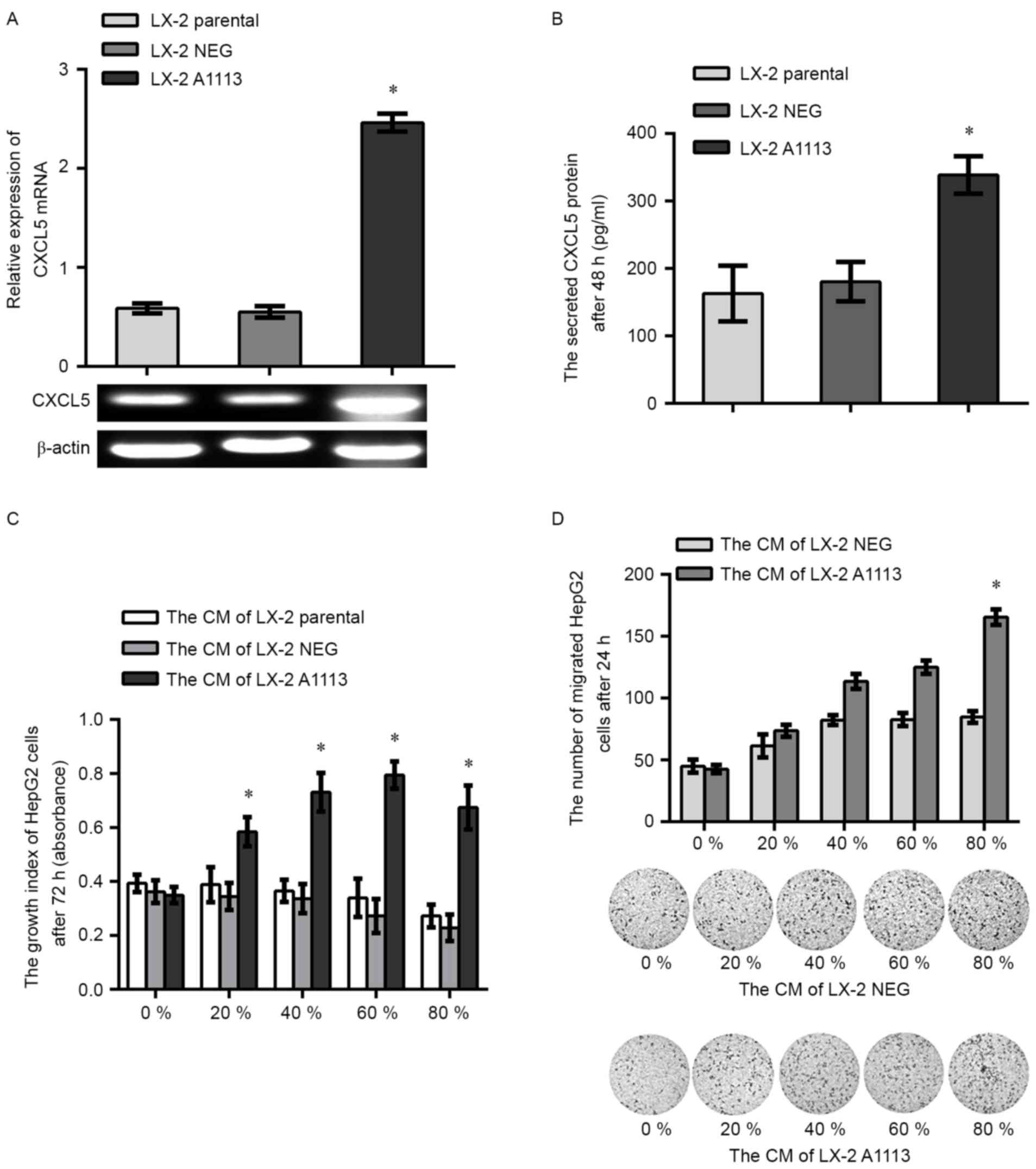 To investigate paracrine role of CXCL5, the identity of CXCL5 overexpression LX-2 cells (LX-2 A1113) and empty vector expression LX-2 cells (LX-2 NEG) was confirmed by RT-PCR (Fig. 4A) and ELISA assays (Fig. 4B). CCK-8 and Transwell assays showed that proliferation and migration of the HepG2 cells treated with the CM of LX-2 A1113 was significantly increased compared with the cells treated with CM from LX-2 parental or LX-2 NEG cells (Fig. 4C and D).