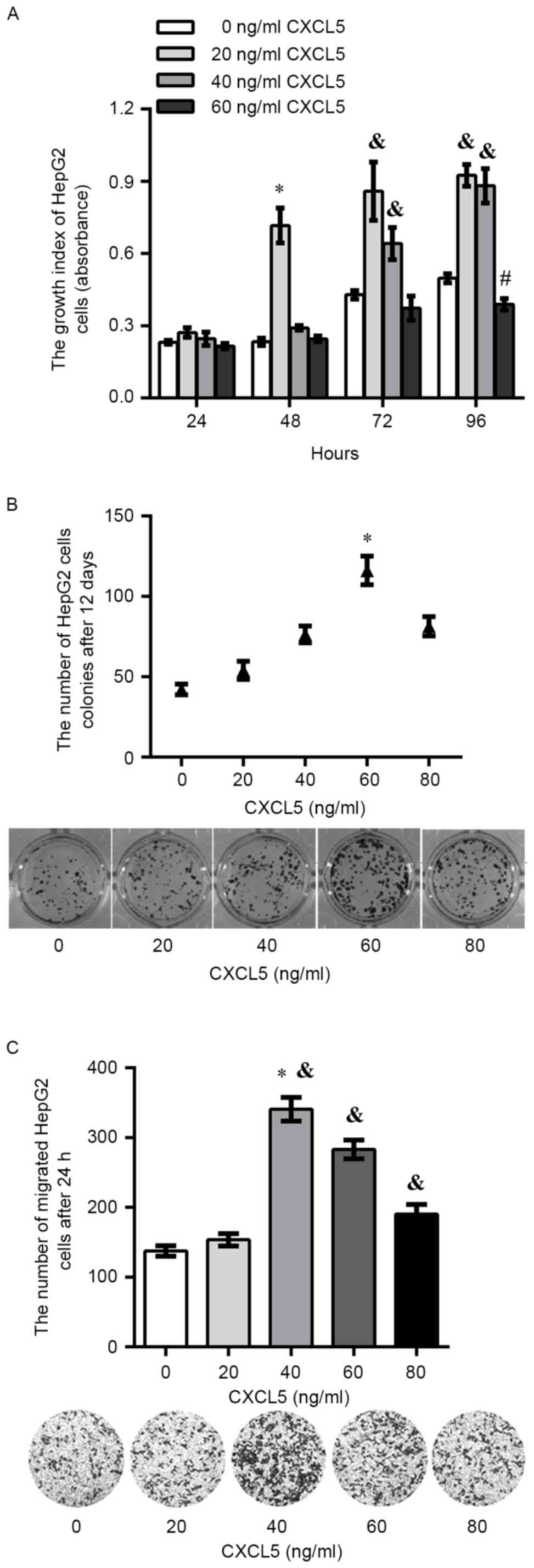 The proliferation assay showed that there was a significant increase in the proliferation of HepG2 cells treated with 20 ng/ml exogenous CXCL5 compared with other concentrations of exogenous CXCL5 after 48 h (P<0.05). In addition, there was a significant increase in HepG2 cells treated with 20 or 40 ng/ml of exogenous CXCL5 after 72 or 96 h. It was observed that 60 ng/ml of exogenous CXCL5 exerted an inhibitory effect on proliferation at each time point, and a significant decrease on growth in HepG2 cells treated with 60 ng/ml of exogenous CXCL5 was found after 96 h (Fig. 2A). After 12 days of incubation, colony formation assay showed that the total colony number in HepG2 cells treated with 60 ng/ml of exogenous CXCL5 was significantly increased compared with 0, 20, 40 or 80 ng/ml exogenous CXCL5 (Fig. 2B). Additionally, a significant increase in migration was observed in HepG2 cells treated with 40, 60 or 80 ng/ml exogenous CXCL5 compared with 0, 20 ng/ml exogenous CXCL5 (Fig. 2C).