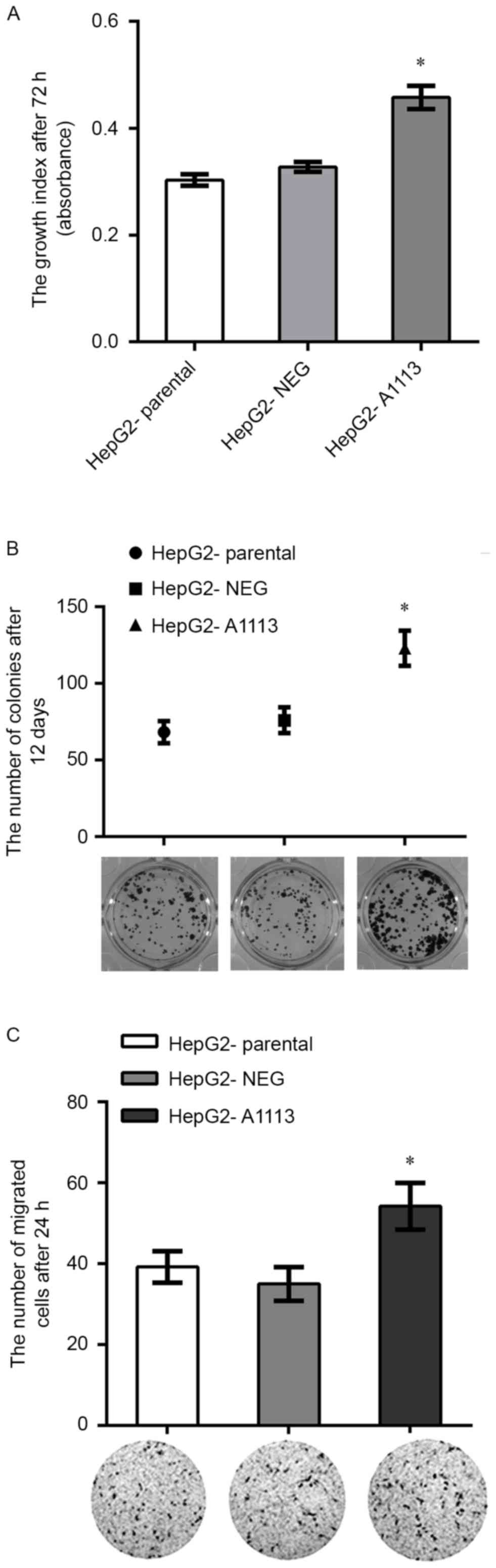To study the autocrine roles of CXCL5 on HepG2 cells, the target gene CXCL5 was successfully transfected into HepG2 cells. RT-PCR and ELISA showed that CXCL5 mRNA and protein expression in CXCL5 overexpression cells (HepG2-A1113) was significantly increased in comparison to parental cells (HepG2-parental) or empty vector expression cells (HepG2-NEG) (Fig. 1A and C). HepG2-A1113 cells exhibited increased growth, colony formation and migration compared with HepG2-parental and HepG2-NEG (Fig. 3A-C).
