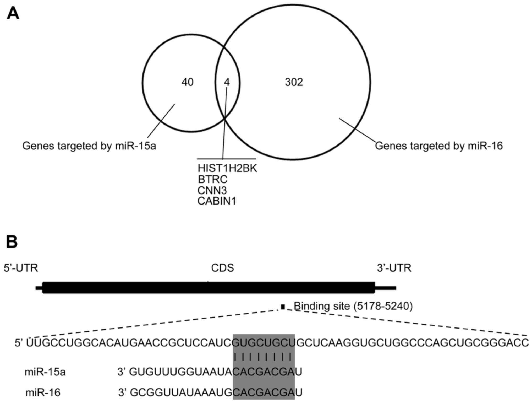 Previously published crosslinking, ligation, and sequencing of hybrids (CLASH) data in 293 cells provided direct evidence for the miRNA-mRNA pairing (17). The CLASH data revealed that four genes, HIST1H2K, BTRC, CNN3 and CABIN1, aretargeted by miR-15a and miR-16 (Fig. 1A). All genes targeted by miR-15aor miR-16 in the CLASH dataset (17) are listed in Table II. CABIN1 is involved in several cellular processes including cell proliferation and the restraint of p53 activity on chromatin (18); therefore, CABIN1 was selected for further investigation. Alignment results indicated that the potential targeting sequence for miR-15a/16 was within the protein-coding region of CABIN1 mRNA between nucleotides 5,178 and 5,240 (Fig. 1B).