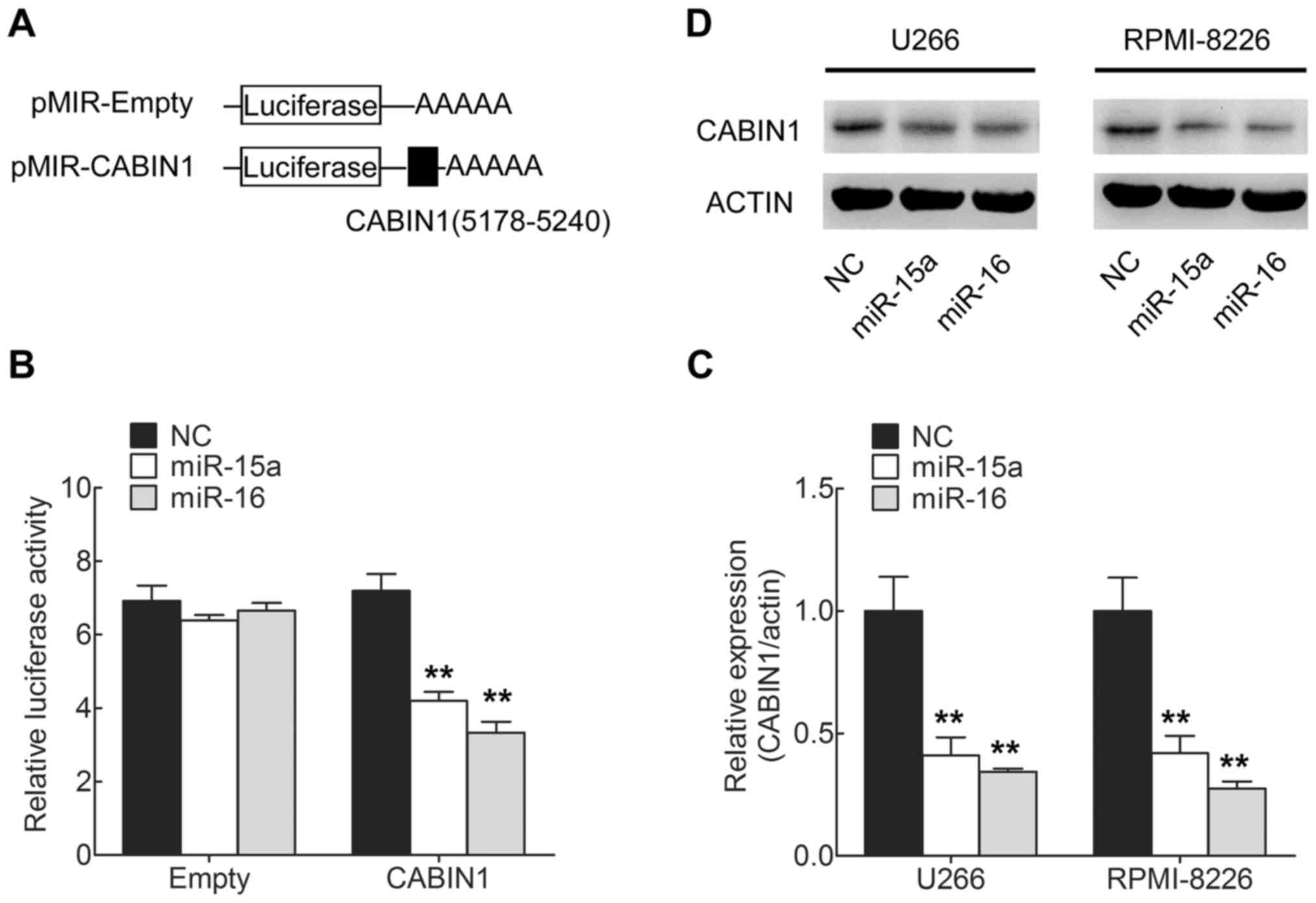 Whether the endogenous CABIN1 in MM cells was similarly regulated was subsequently investigated. The MMU266 and RPMI-8226 cells lines were transfected with miR-15a and miR-16, and CABIN1 mRNA and protein levels were examined by RT-qPCR and western blotting, respectively. The levels of CABIN1 mRNA (Fig. 2C) and protein (Fig. 2D) were consistently and substantially downregulated by miR-15a and miR-16 in MM cells. The results of the present study indicated that miR-15a and miR-16 directly targeted CABIN1 mRNA and negatively regulated expression of CABIN1 at the mRNA and protein level.