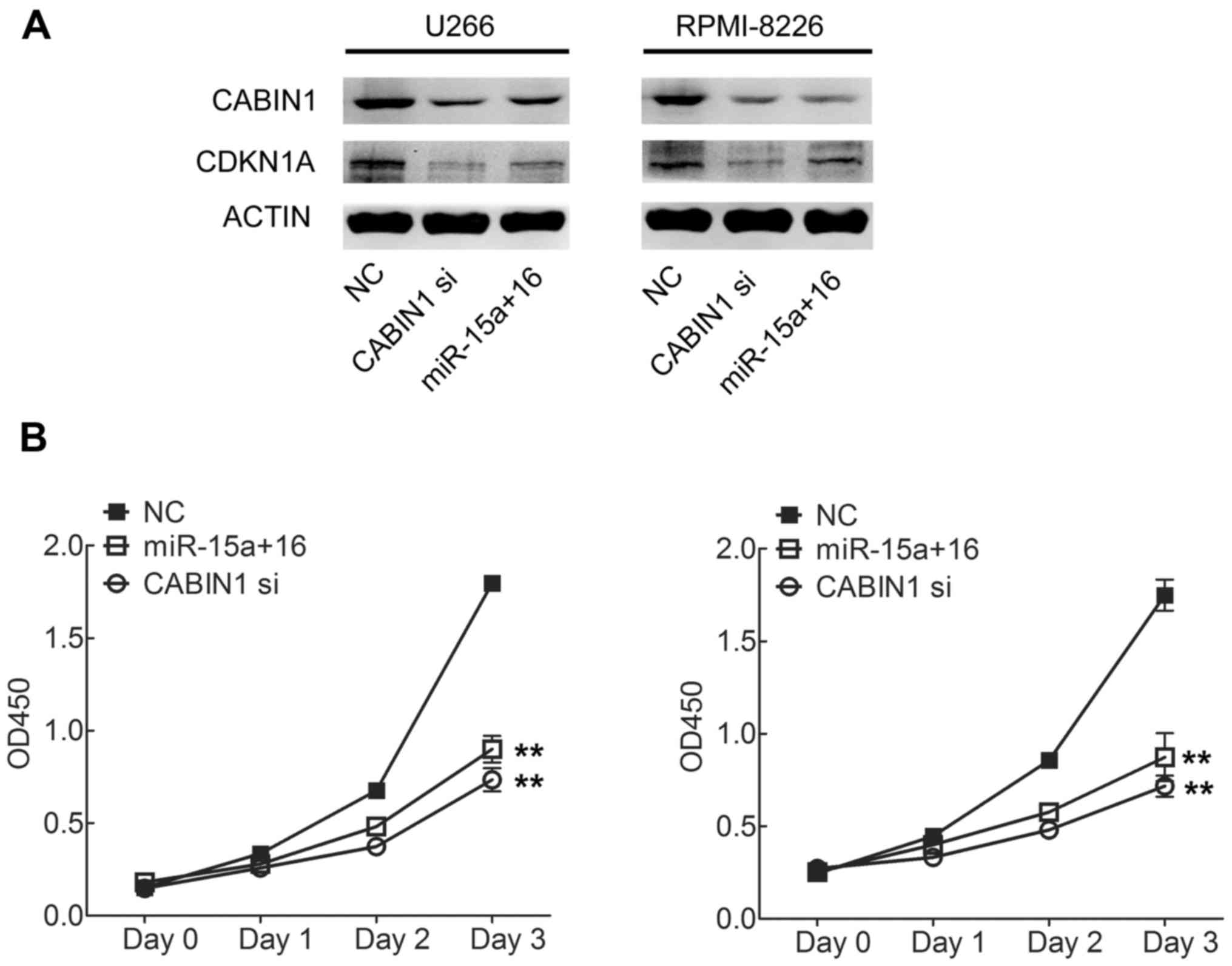 Future studies must investigate gene expression changes in the p53-p21 signaling pathway, in order to verify that miR-15a miR-16 affects MM cell viability through CABIN1, and that CABIN1 increases the proliferation of cancer cells via suppressing p53 transcriptional activity towards its target genes, including CDKN1A. Other studies have indicated that miR-15 could inhibit protein kinase B, nuclear factor κ-light-chain-enhancer of activated B cells and vascular endothelial growth factor activity, thus exerting antitumor effects (8,18), which should be considered in future studies.