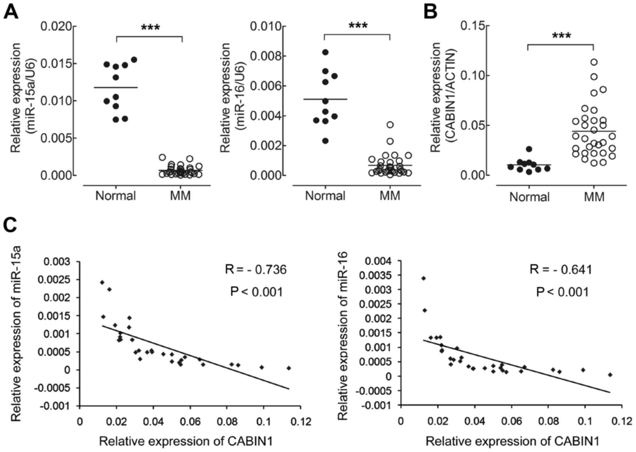 Previous studies have reported that miR-15a and miR-16 downregulated in several types of cancer, including MM (8,19). Overexpression of CABIN1 is associated with poorer patient outcomes in a number of cancer types (18,20,21). The results of the present study demonstrated that CABIN1 is negatively regulated by miR-15a and miR-16 in MM cells. Next, the correlation between miR-15a and miR-16 expression levels and CABIN1 mRNA levels was assessed in MM specimens.