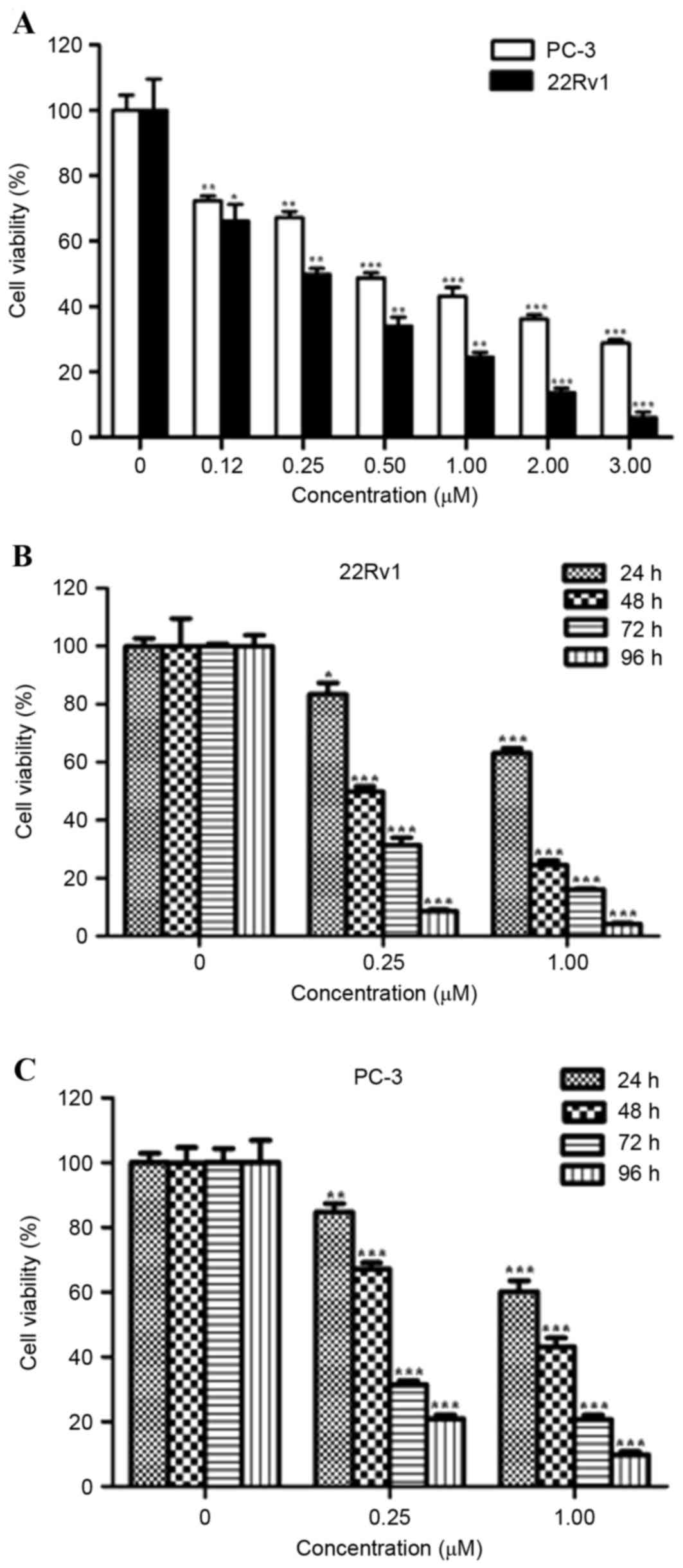 The ability of OBZ to inhibit the growth of 22Rv1 and PC-3 cells was determined by counting cell number. OBZ markedly inhibited the cell viability of 22Rv1 and PC-3 cells in a dose-dependent manner (Fig. 1A). As little as 0.12 µM of OBZ was observed to significantly inhibit the growth of the 22Rv1 and PC-3 cells, respectively (both P<0.05). The 22Rv1 cells were more sensitive to OBZ treatment, with a half-maximal inhibitory concentration (IC50) value of 0.25 µM, compared with 0.64 µM in PC-3 cells. OBZ inhibited the cell viability of 22Rv1 and PC-3 cells in a time-dependent manner (Fig. 1B and C). These results demonstrated that OBZ inhibited the growth of PCa cells in vitro with varied efficiency.