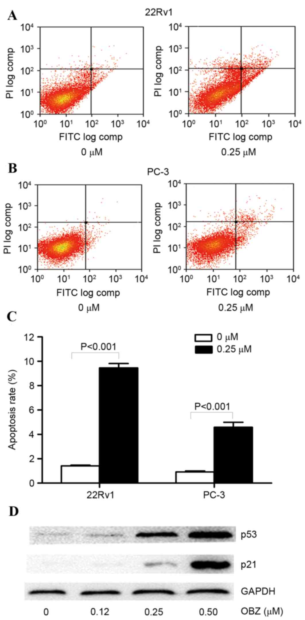 To investigate the mechanism of the inhibitory effect of OBZ in PCa cells, the effect of OBZ on the expression of p53 and p21 (41,42), which are known to be the key regulators of apoptosis, was measured via western blot analysis in the OBZ-treated cells. An OBZ dose of ≥0.25 µM markedly increased p53 and p21 expression in 22Rv1 cells (Fig. 2D). These results suggested that upregulation of p53 and p21 served an important role in the OBZ-induced apoptosis of 22Rv1 cells.
