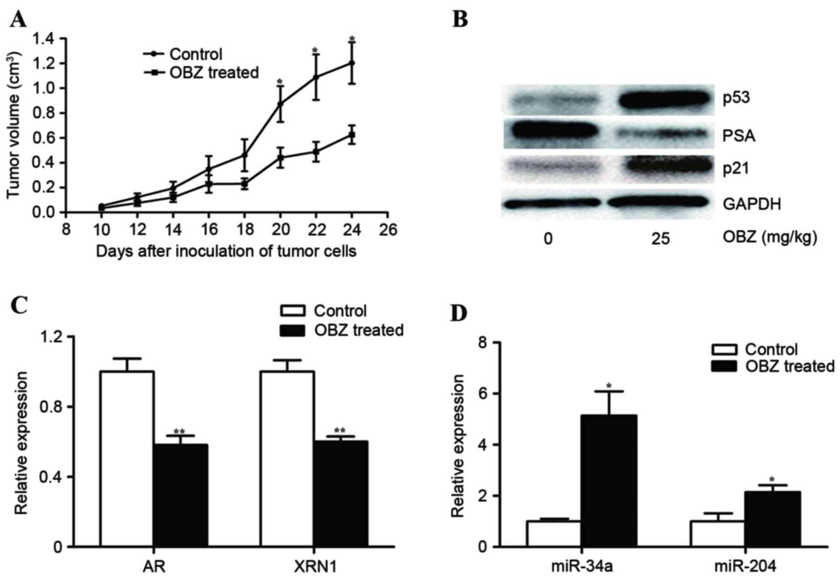 The AR serves a critical role in the progression and recurrence of PCa (45), and is also the transcriptional activator of PSA expression (46). Therefore, downregulation of PSA by OBZ indicates that OBZ affects the AR or ASP. Recently, a study reported the existence of the AR-miR-204-XRN1 axis in PCa cells, which has a dual regulatory function in mediating the growth of different PCa cells (47). In this axis, androgen/AR raises the level of XRN1, a target of miR-204, by inhibiting expression of miR-204. Accordingly, whether OBZ affects the AR-miR-204-XRN1 axis in 22Rv1 tumors was investigated. Levels of AR, miR-204 and XRN1 in the mouse tumors were measured by qPCR. Expression of AR and XRN1 was significantly lower in OBZ-treated tumors than in the control (both P<0.01; Fig. 3C). By contrast, OBZ raised the expression of miR-204 ~115% (Fig. 3D). Together, these results indicated that OBZ interfered with the AR-miR-204-XRN1 axis in PCa tumors.