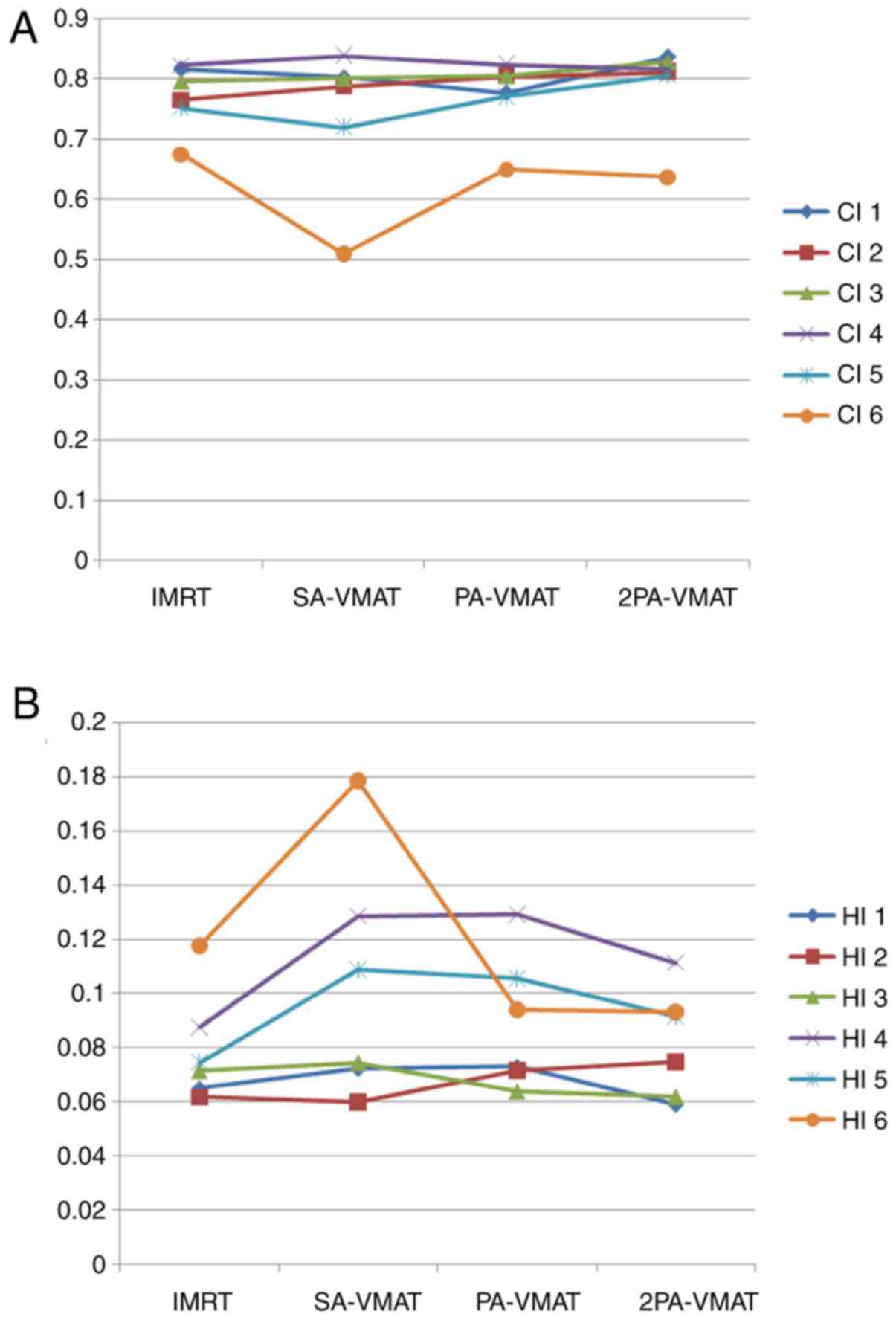 In central lung cancer, in case of either SCLC or positive metastatic mediastinal lymph nodes, PTV needs to encompass the mediastinum. Fig. 7 illustrated the DVH and dose distributions of IMRT and VMAT plans of a patient with central lung cancer whose PTV encompasses the mediastinum. Figs. 8 and 9 illustrate the CI, HI and OAR dosage of each patient.