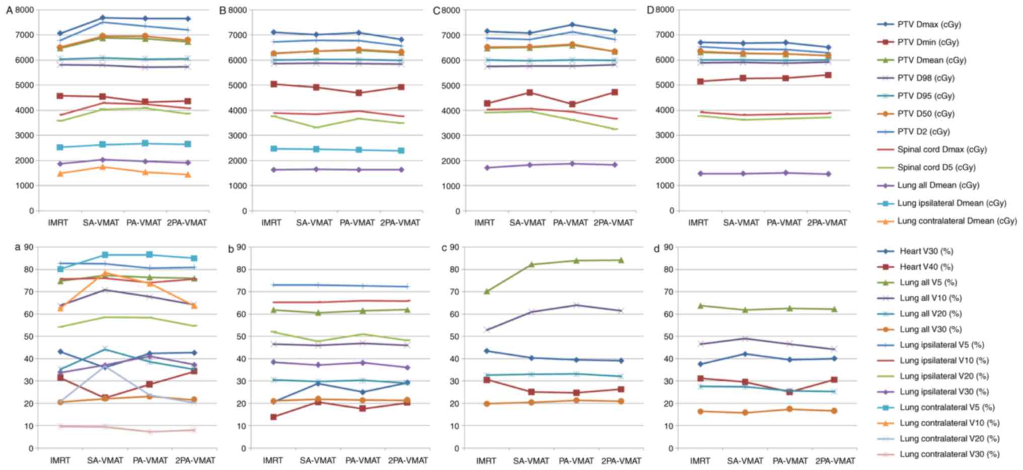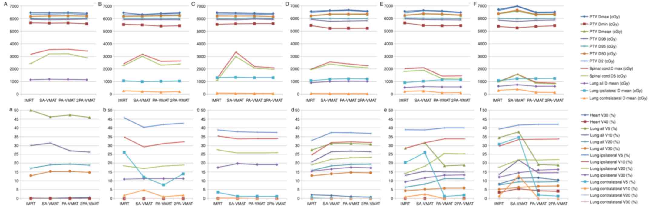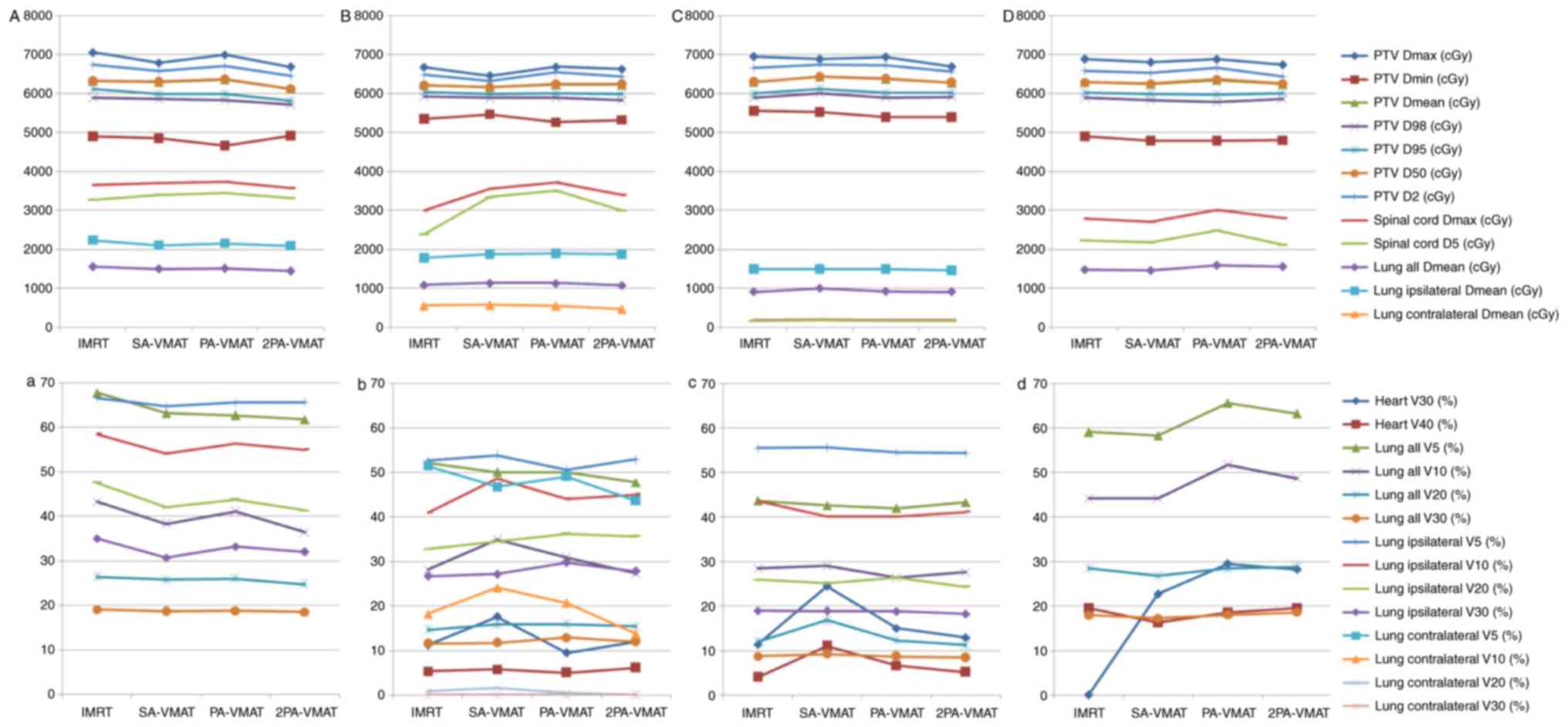 Table IV.Dosage comparison between VMAT and IMRT plans in central lung cancer in which the target volume encompassing the mediastinal lymphatic drainage region. |