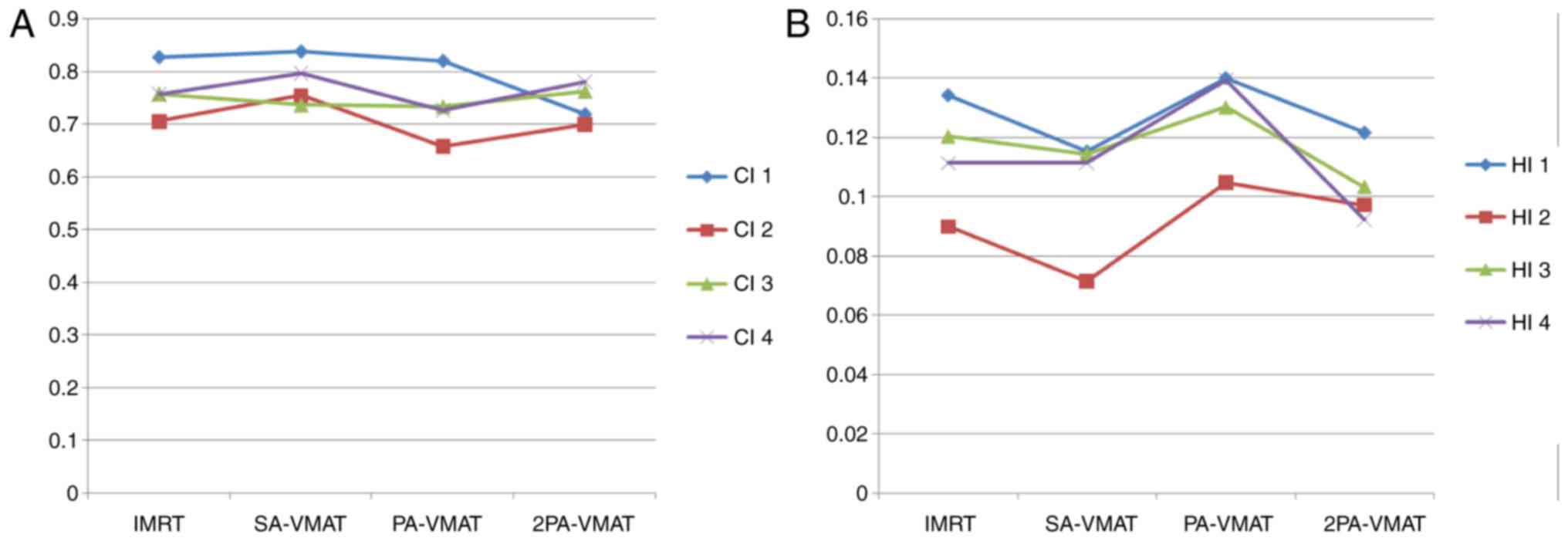 HI=D2%–D98%D50%D2, D98 and D50% represent the dose of 2, 98 and 50% target volume. Values of HI closer to 0 indicate greater dose homogeneity within the volume of PTV, while large values indicate more heterogeneous dose distribution.