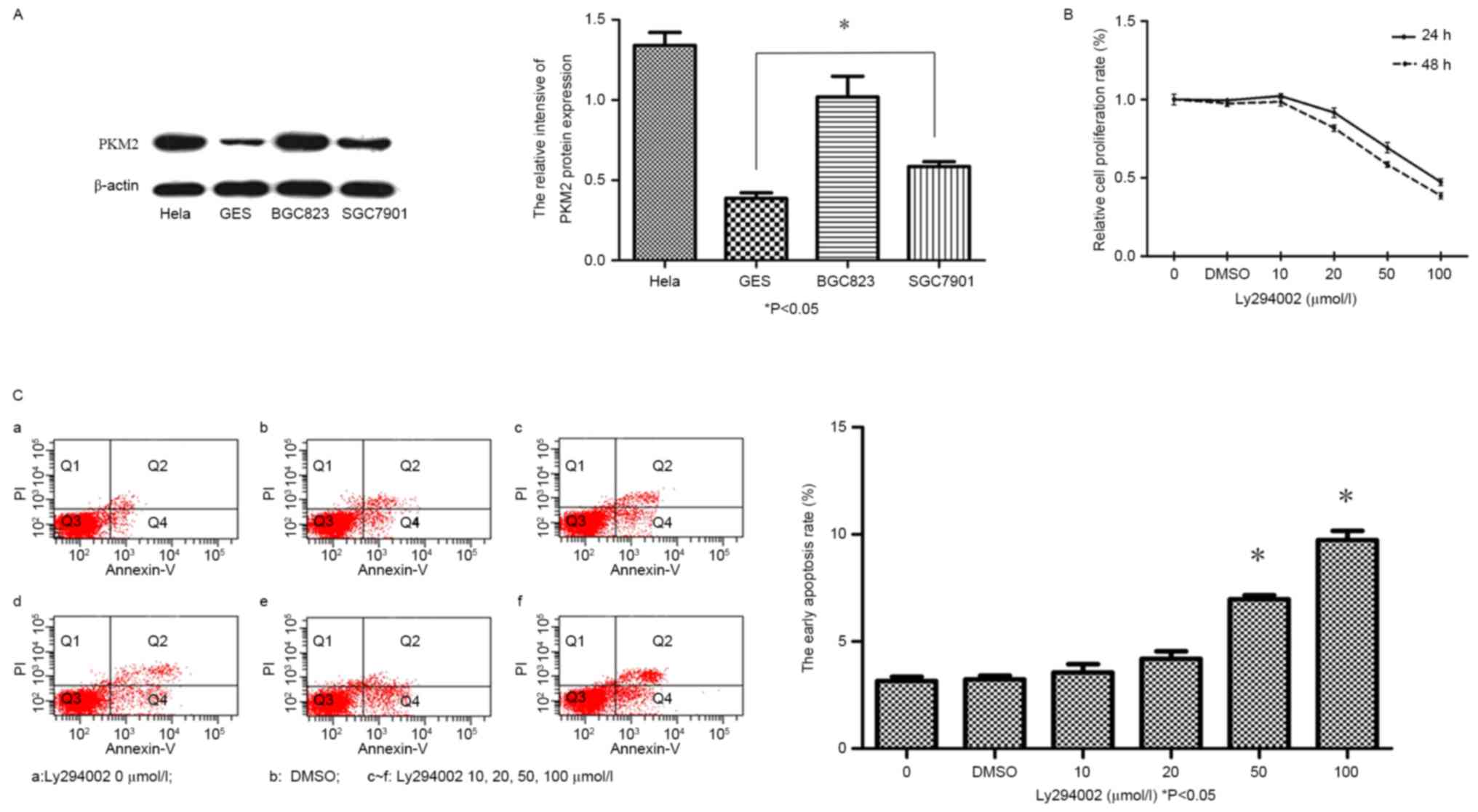 In conclusion, the present study demonstrated significantly increased PKM2 expression in GC cell lines, and revealed that LY294002 markedly inhibited the proliferation, induced the apoptosis and inhibited the Warburg effect of GC cells. Therefore, the anticancer activities of LY294002 may be partly linked to the downregulation of PKM2.