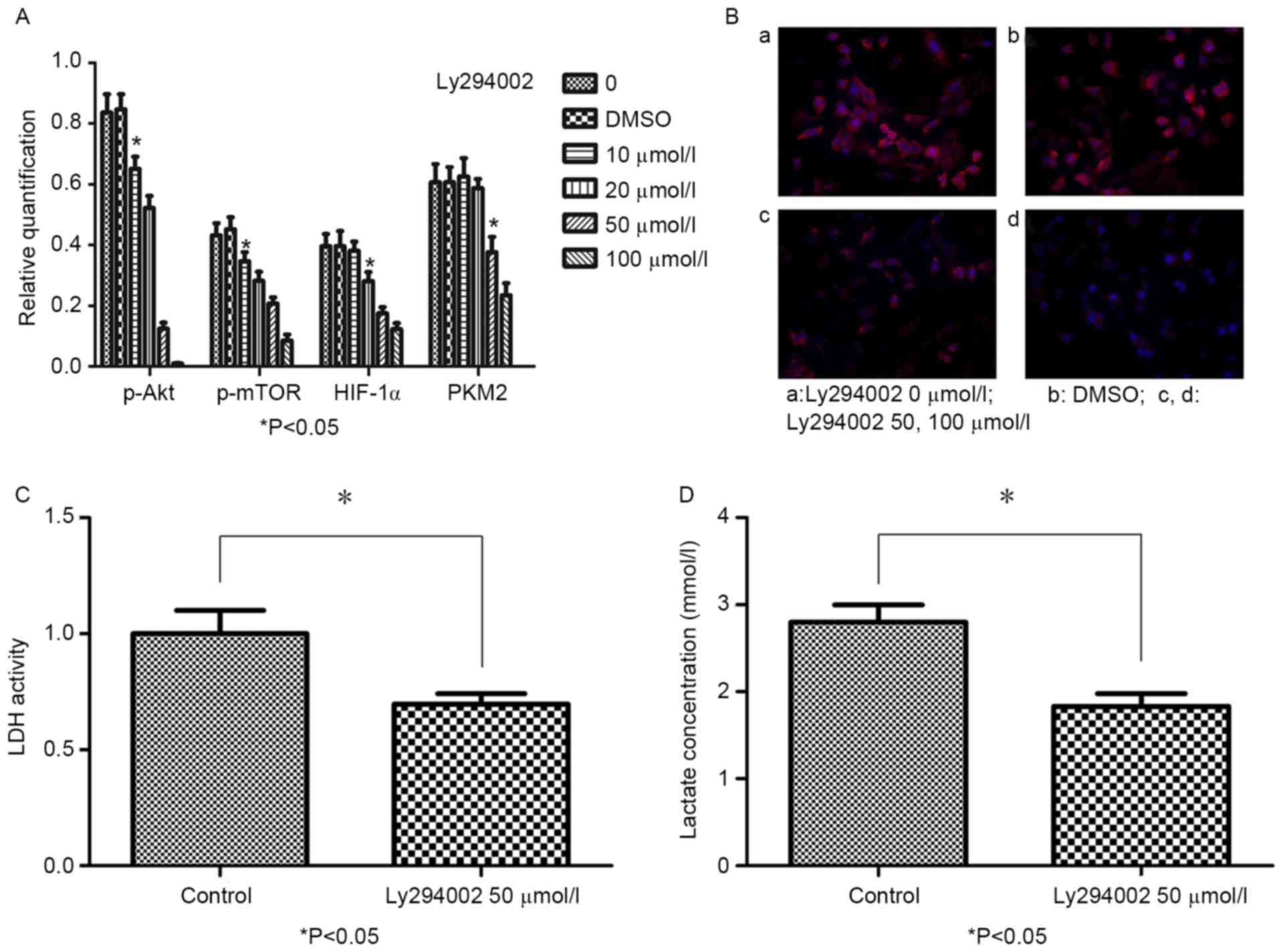 To determine the effects of LY294002 on LDH activity and lactate production in BGC-823 cells, LDH activity and lactate production were measured. LDH activity (Fig. 2C) and lactate production (Fig. 2D) in the 50 µmol/l LY294002 group were significantly decreased compared with in the control group (P<0.05).